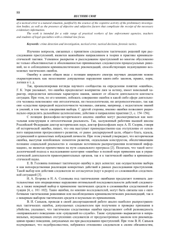 Общеметодологический анализ представлений о сущности категории «ошибка», а также понимание в различных отраслях знаний ее содержания и характерных черт позволил сформировать авторскую позицию на понятие «тактическая ошибка». Авторами приводится интерпретация категории «тактическая ошибка» как с позиции социально-гуманитарных знаний, так и криминалистической науки. Указывается, что возникновение тактической ошибки является закономерной ситуацией, обоснованной сутью познавательной деятельности органов предварительного расследования, а также наличием объективных и субъективных факторов, затрудняющих получение необходимой доказательственной информации.