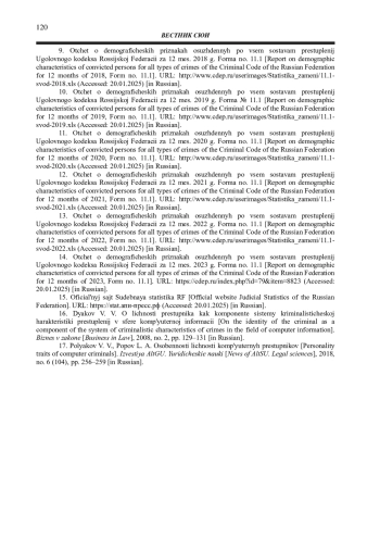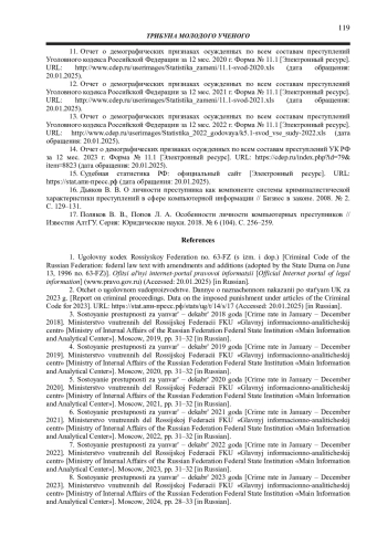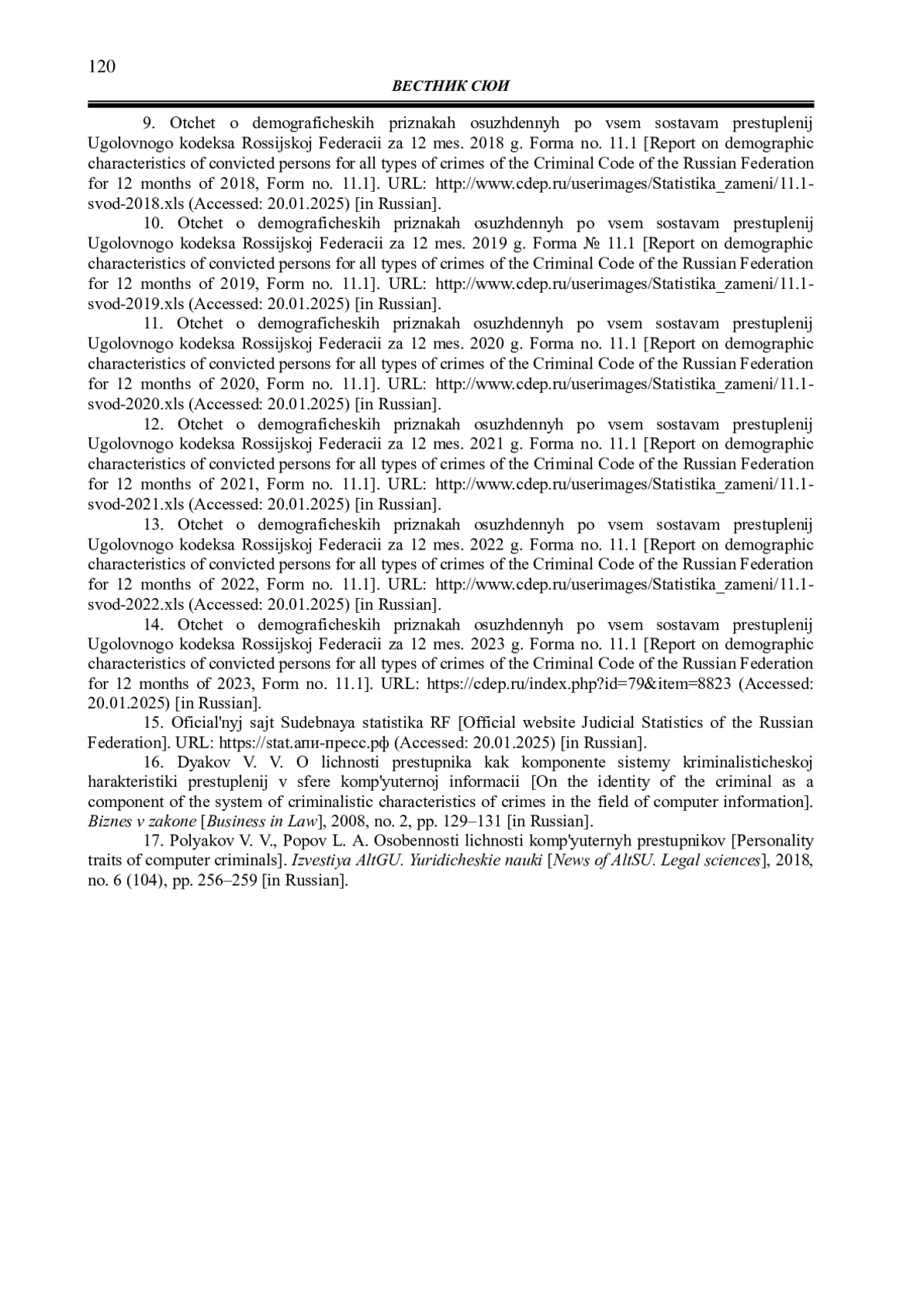 ЗВЯГИНЦЕВА Е. Н., УЛЕНДЕЕВА Н. И., ЛИПНИЦКАЯ А. О. ИССЛЕДОВАНИЕ ПОРТРЕТА ЛИЦА, СОВЕРШИВШЕГО ПРЕСТУПЛЕНИЕ ПО СТАТЬЕ 272 «НЕПРАВОМЕРНЫЙ ДОСТУП К КОМПЬЮТЕРНОЙ ИНФОРМАЦИИ» УГОЛОВНОГО КОДЕКСА РОССИЙСКОЙ ФЕДЕРАЦИИ // ВЕСТНИК САМАРСКОГО ЮРИДИЧЕСКОГО ИНСТИТУТА. 2025. № 1 (62)