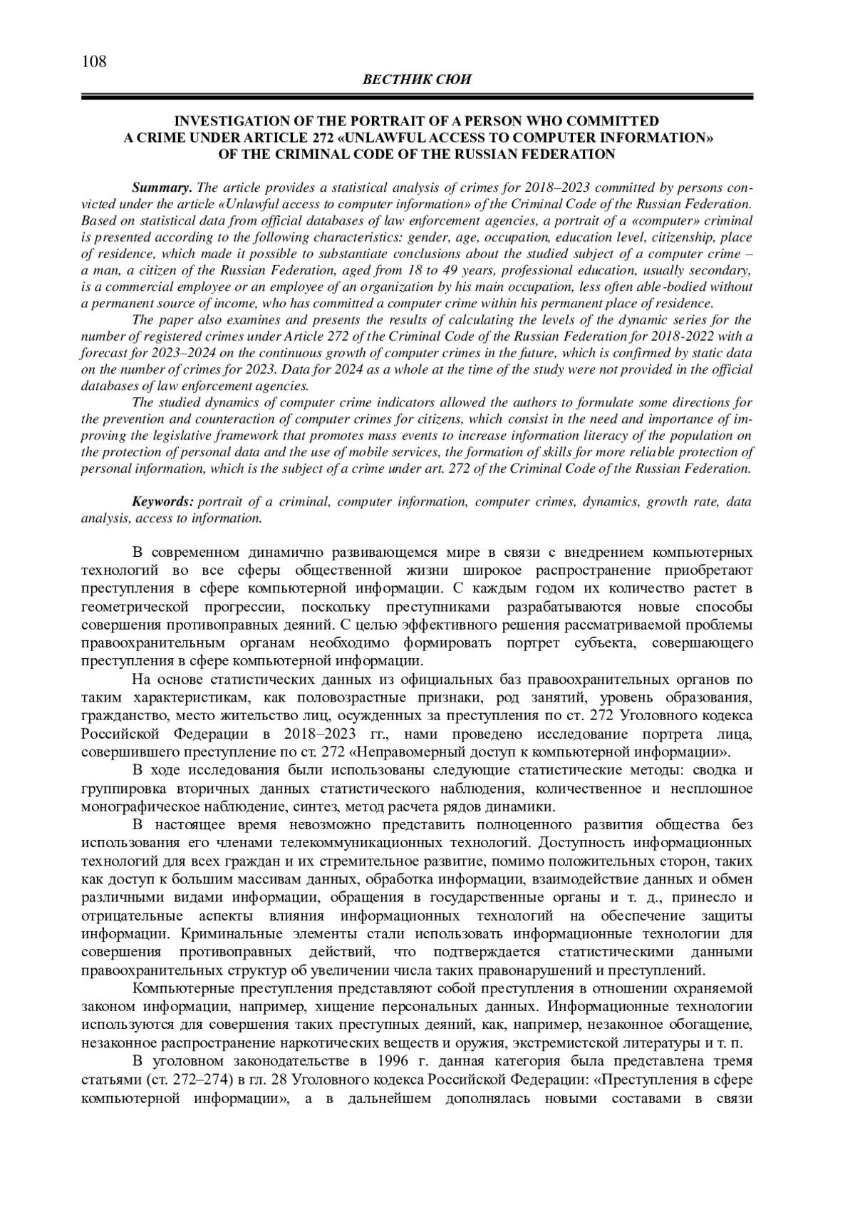 Статья: ИССЛЕДОВАНИЕ ПОРТРЕТА ЛИЦА, СОВЕРШИВШЕГО ПРЕСТУПЛЕНИЕ ПО СТАТЬЕ 272 «НЕПРАВОМЕРНЫЙ ДОСТУП К КОМПЬЮТЕРНОЙ ИНФОРМАЦИИ» УГОЛОВНОГО КОДЕКСА РОССИЙСКОЙ ФЕДЕРАЦИИ (2025)