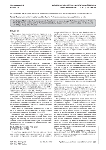 Современное российской общество столкнулось с реальной угрозой национальной безопасности Российской Федерации. Законодатель, в свою очередь, не остался в стороне и криминализовал ряд деяний, которые связаны с дискредитацией использования Вооруженных Сил Российской Федерации (далее – ВС РФ). Такое оперативное реагирование законодателя на изменения (связанные с ростом угроз нового характера обеспечению правопорядка в стране) детерминировали ряд вопросов от правоприменителя: что такое дискредитация в уголовном праве; по каким критериям разграничивать смежные составы правонарушений как в различных отраслях права (ст. 20.3.3. КоАП РФ и ст. 280. 3 УК РФ), так и внутри самого уголовного законодательства (ст. 207.3 и ст. 280.3 УК РФ)?