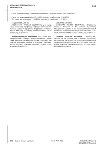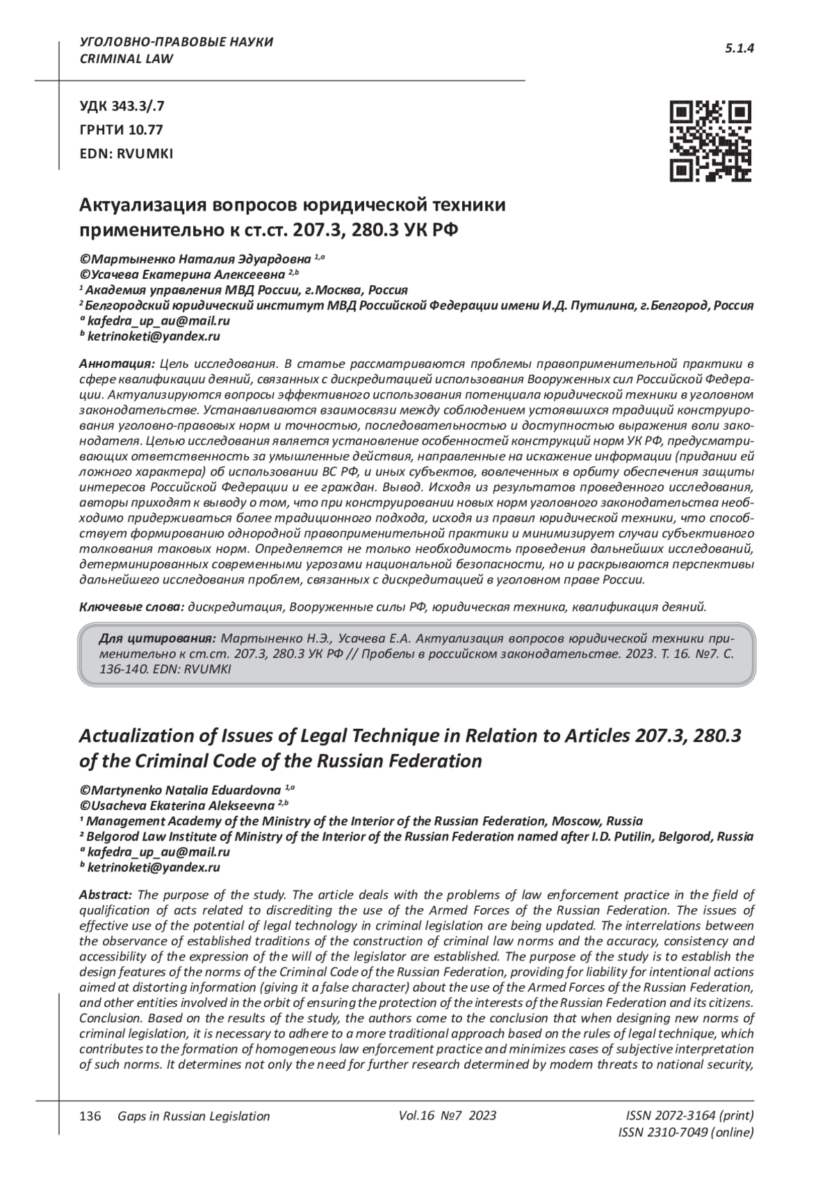 Цель исследования. В статье рассматриваются проблемы правоприменительной практики в сфере квалификации деяний, связанных с дискредитацией использования Вооруженных сил Российской Федерации. Актуализируются вопросы эффективного использования потенциала юридической техники в уголовном законодательстве. Устанавливаются взаимосвязи между соблюдением устоявшихся традиций конструирования уголовно-правовых норм и точностью, последовательностью и доступностью выражения воли законодателя. Целью исследования является установление особенностей конструкций норм УК РФ, предусматривающих ответственность за умышленные действия, направленные на искажение информации (придании ей ложного характера) об использовании ВС РФ, и иных субъектов, вовлеченных в орбиту обеспечения защиты интересов Российской Федерации и ее граждан. Вывод. Исходя из результатов проведенного исследования, авторы приходят к выводу о том, что при конструировании новых норм уголовного законодательства необходимо придерживаться более традиционного подхода, исходя из правил юридической техники, что способствует формированию однородной правоприменительной практики и минимизирует случаи субъективного толкования таковых норм. Определяется не только необходимость проведения дальнейших исследований, детерминированных современными угрозами национальной безопасности, но и раскрываются перспективы дальнейшего исследования проблем, связанных с дискредитацией в уголовном праве России.