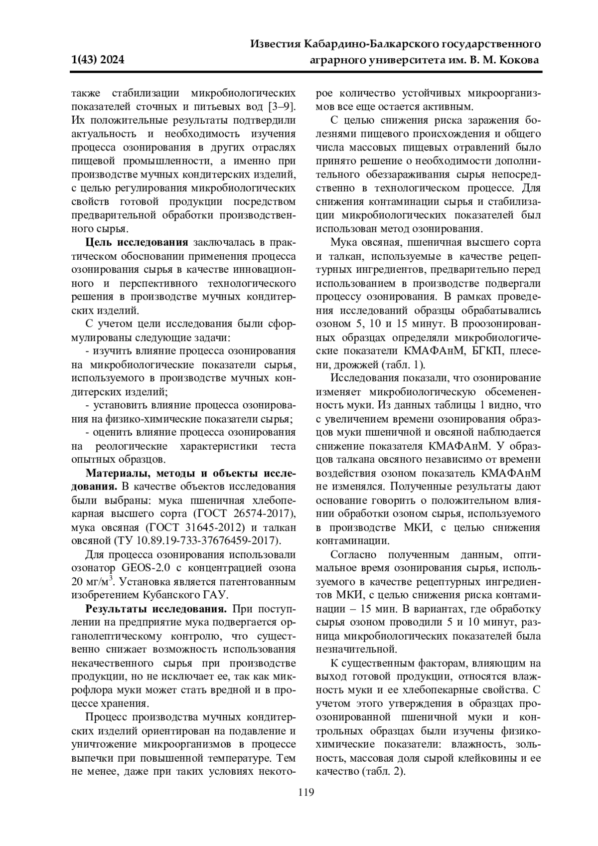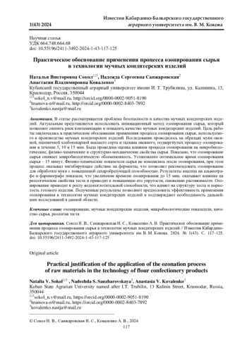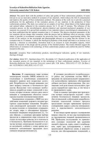 В статье рассматривается проблема безопасности и качества мучных кондитерских изделий. Актуальным представляется использовать инновационный метод озонирования сырья, который позволяет снизить риск контаминации и повысить качество мучных кондитерских изделий. Цель работы заключалась в практическом обосновании применения процесса озонирования сырья, используемого в производстве мучных кондитерских изделий. Исследование проводилось на образцах муки овсяной, пшеничной хлебопекарной высшего сорта и талкана овсяного, подвергнутых процессу озонирования в течение 5, 10 и 15 мин. Была проведена оценка влияния процесса озонирования на микробиологические, физико-химические и структурно-механические свойства сырья. Показано, что озонирование сырья снижает микробиологическую обсемененность. Установлено оптимальное время озонирования сырья - 15 минут. Физико-химические показатели сырья не изменялись после озонирования, при этом процесс оказывал ингибирующее действие на ферменты, что позволяет рекомендовать озонирование для обработки муки с повышенной сахаробразующей способностью. Результаты анализа на альвеографе и фаринографе показали, что увеличение времени озонирования до 15 мин. оказывает влияние на реологические свойства теста и приводит к повышению его упругости, снижению растяжимости. Озонирование приводит к росту водопоглотительной способности, что влияет на структуру теста и пористость готового изделия. Полученные результаты позволяют предположить эффективность применения озонирования в технологии мучных кондитерских изделий и подтверждают необходимость дальнейших исследований в данной области.