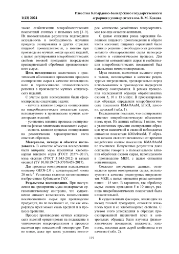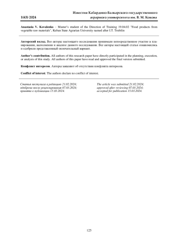 Данная работа посвящена выявлению изменений физико-химических показателей полуфабрикатов и ликероводочных изделий при обработке их холодом и оклеивающими веществами. Исследования проводились в условиях ООО «Эльбрус Спиритс» и на кафедре «Технология производства и переработки сельскохозяйственной продукции» Кабардино-Балкарского ГАУ в 2021-2023 гг. В качестве объектов исследований служили морсы и соки, выработанные из рябины, яблок и брусники. Спиртованные плодово-ягодные морсы и соки обрабатывали холодом при температурах: минус 3 + минус 6°С. Пробная обработка спиртованных соков показала, что оптимальная доза поливинилпирролидона (ПВП) для рябинового и брусничного соков составляет 200 мг/л, яблочного - 20 мг/л. Установлено, что при обработке ПВП и бентонитом значительно снижается количество фенольных веществ сока. При обработке спиртованных соков по данной схеме не наблюдалось заметного изменения содержания пектиновых веществ. Для предупреждения коллоидных помутнений рекомендованы следующие виды обработок: обработка холодом, заключающаяся в охлаждении полуфабрикатов или купажа до температуры (минус 3 + минус 6°С) и выдержка при этой температуре до 48 ч с последующей фильтрацией на холоду; обработка ПВП и бентонитом, для полуфабрикатов доза не превышает 200 мг/л, купажа - 100 мг/л. Количество бентонита, применяемого при этом, - 0,5-1,0 г/л. Отмечено, что наблюдается прямая пропорциональность между количеством добавленного желатина и деленных фенольных веществ, максимальное содержание полифенолов, связанных единицей желатина, при минимальной дозе оклеивающего материала. Наблюдение за стабильностью обработанного напитка показало, что оптимальная доза желатина 50 мг/л. При обработке указанной дозой в сочетании с 0,5 г/л бентонита напиток сохраняет товарный вид в течение 8 месяцев, контрольный образец - 2 месяцев.