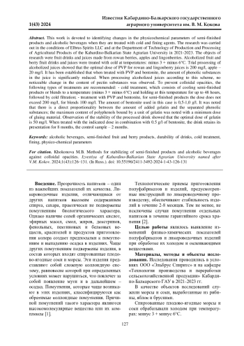 Данная работа посвящена выявлению изменений физико-химических показателей полуфабрикатов и ликероводочных изделий при обработке их холодом и оклеивающими веществами. Исследования проводились в условиях ООО «Эльбрус Спиритс» и на кафедре «Технология производства и переработки сельскохозяйственной продукции» Кабардино-Балкарского ГАУ в 2021-2023 гг. В качестве объектов исследований служили морсы и соки, выработанные из рябины, яблок и брусники. Спиртованные плодово-ягодные морсы и соки обрабатывали холодом при температурах: минус 3 + минус 6°С. Пробная обработка спиртованных соков показала, что оптимальная доза поливинилпирролидона (ПВП) для рябинового и брусничного соков составляет 200 мг/л, яблочного - 20 мг/л. Установлено, что при обработке ПВП и бентонитом значительно снижается количество фенольных веществ сока. При обработке спиртованных соков по данной схеме не наблюдалось заметного изменения содержания пектиновых веществ. Для предупреждения коллоидных помутнений рекомендованы следующие виды обработок: обработка холодом, заключающаяся в охлаждении полуфабрикатов или купажа до температуры (минус 3 + минус 6°С) и выдержка при этой температуре до 48 ч с последующей фильтрацией на холоду; обработка ПВП и бентонитом, для полуфабрикатов доза не превышает 200 мг/л, купажа - 100 мг/л. Количество бентонита, применяемого при этом, - 0,5-1,0 г/л. Отмечено, что наблюдается прямая пропорциональность между количеством добавленного желатина и деленных фенольных веществ, максимальное содержание полифенолов, связанных единицей желатина, при минимальной дозе оклеивающего материала. Наблюдение за стабильностью обработанного напитка показало, что оптимальная доза желатина 50 мг/л. При обработке указанной дозой в сочетании с 0,5 г/л бентонита напиток сохраняет товарный вид в течение 8 месяцев, контрольный образец - 2 месяцев.