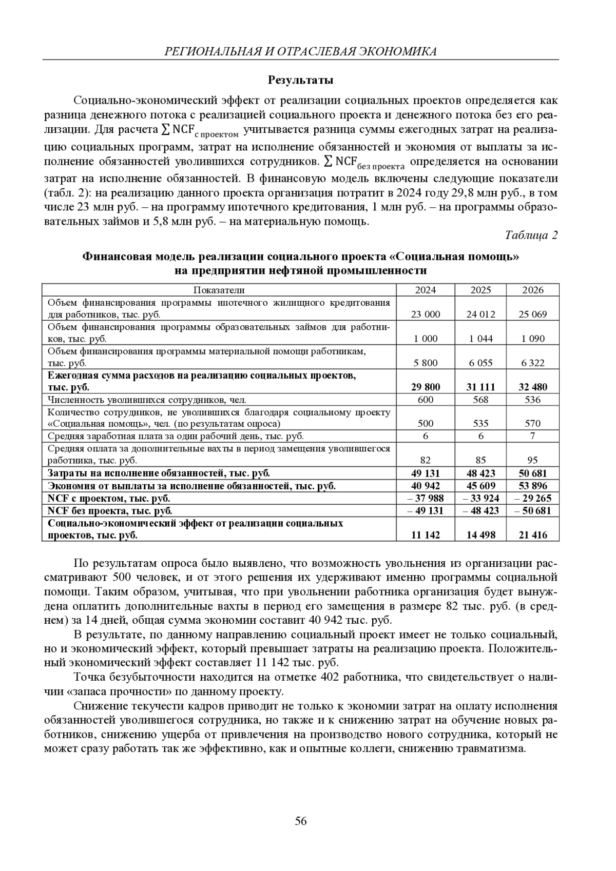 В статье проведен анализ социального эффекта реализации проекта, направленного на сокращение текучести кадров, а также оценены экономические последствия повышения лояльности персонала. В результате была разработана финансовая модель, которая включает анализ экономии от выплаты за исполнения обязанностей. Ее апробация на материалах Филиала ПАО АНК «Башнефть» показала, что применение комплексного подхода к выявлению социального эффекта позволяет более обоснованно оценивать экономическую эффективность социальных проектов