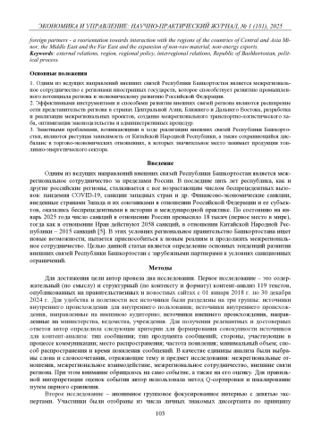 Одним из ведущих направлений внешних связей Республики Башкортостан является межрегиональное сотрудничество за пределами России. В последние пять лет республика, как и другие российские регионы, сталкивается с все возрастающим числом беспрецедентных вызовов: пандемия COVID-19, санкции западных стран и др. Финансово-экономические санкции, введенные странами Запада и их союзниками в отношении Российской Федерации и ее субъектов, оказались беспрецедентными в истории и международной практике. По состоянию на январь 2025 года число санкций в отношении России превысило 18 тысяч (первое место в мире), тогда как в отношении Иран действуют 2058 санкций, в отношении Китайской Народной Республики – 2015 санкций [5]. В этих условиях региональное правительство Башкортостана ищет новые возможности, пытается приспособиться к новым реалиям и продолжить межрегиональное сотрудничество. Целью данной статьи является определение основных тенденций развития внешних связей Республики Башкортостан с зарубежными партнерами в условиях санкционных ограничений