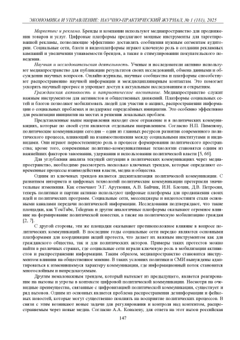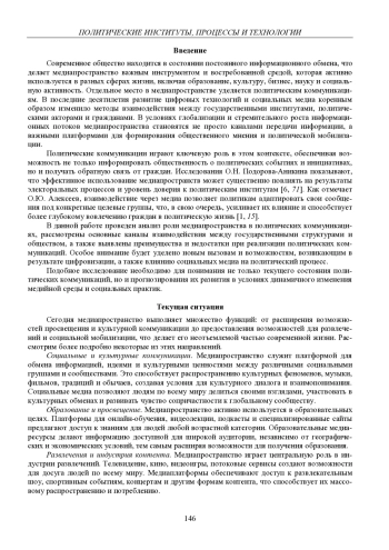 Современное общество находится в состоянии постоянного информационного обмена, что делает медиапространство важным инструментом и востребованной средой, которая активно используется в разных сферах жизни, включая образование, культуру, бизнес, науку и социальную активность. Отдельное место в медиапространстве уделяется политическим коммуникациям. В последние десятилетия развитие цифровых технологий и социальных медиа коренным образом изменило методы взаимодействия между государственными институтами, политическими акторами и гражданами. В условиях глобализации и стремительного роста информационных потоков медиапространства становятся не просто каналами передачи информации, а важными платформами для формирования общественного мнения и политической мобилизации.