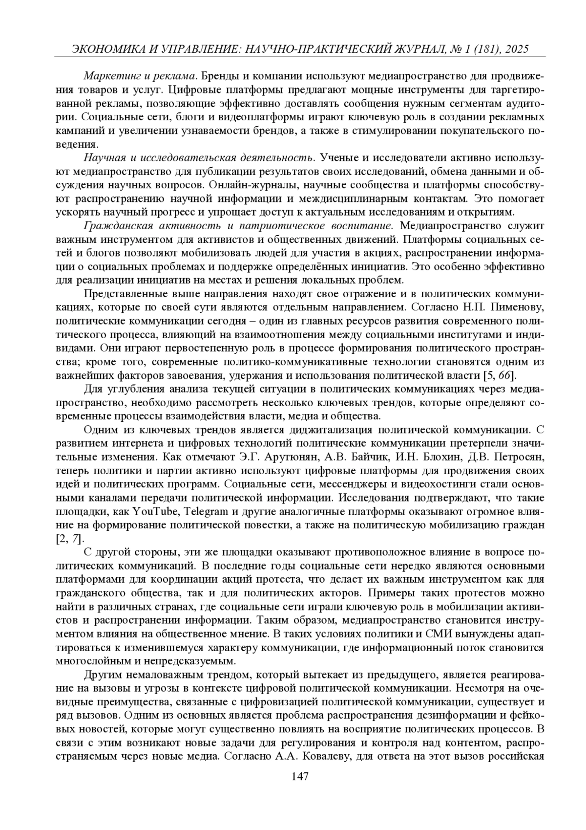 4. 	Ковалев А.А. СМИ и политическая коммуникация: новые возможности и ограничения // Вестник Поволжского института управления. 2022. Т. 22, № 3. С. 69-83.  EDN: LAEFPC