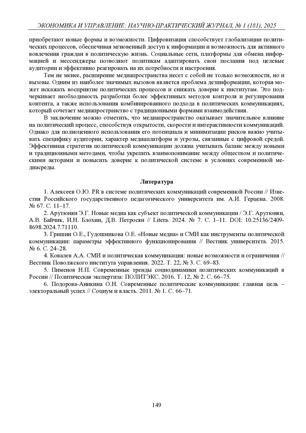 2. 	Арутюнян Э.Г. Новые медиа как субъект политической коммуникации / Э.Г. Арутюнян, А.В. Байчик, И.Н. Блохин, Д.В. Петросян // Litera. 2024. № 7. С. 1-11.  DOI: 10.25136/2409-8698.2024.7.71110