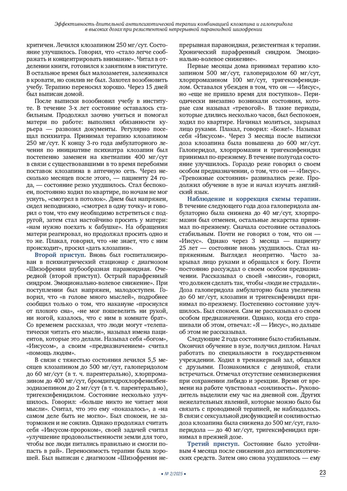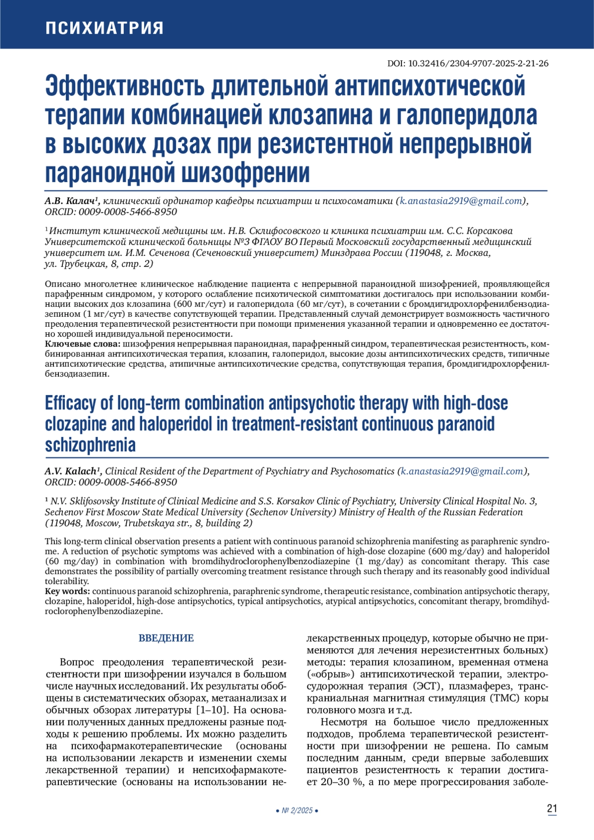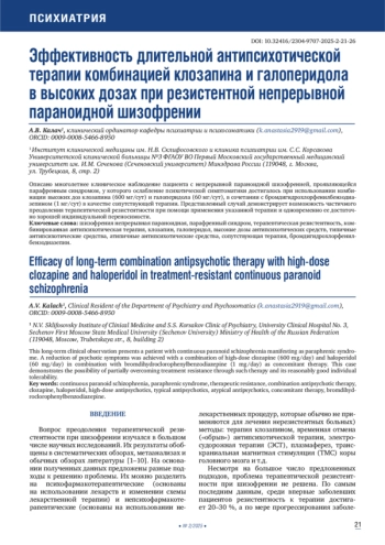 21. 	Cipolla S., Delli Carpini F., Catapano P., et al. Two long-acting antipsychotics in a patient with treatment-resistant schizophrenia: A case report. Clin Pract.2025 Mar;15(3):55. DOI: 10.3390/clinpract15030055
