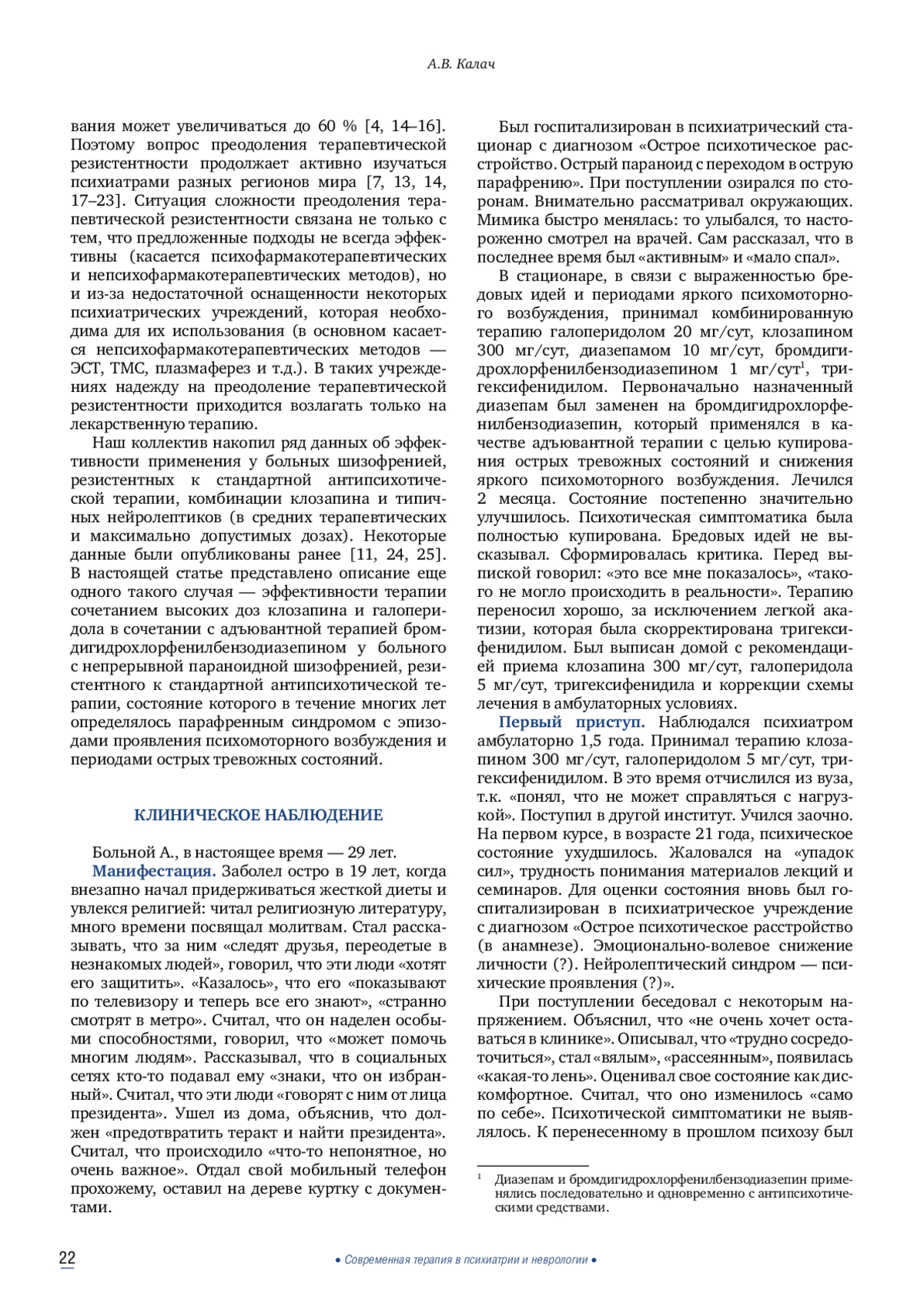 Описано многолетнее клиническое наблюдение пациента с непрерывной параноидной шизофренией, проявляющейся парафренным синдромом, у которого ослабление психотической симптоматики достигалось при использовании комбинации высоких доз клозапина (600 мг/сут) и галоперидола (60 мг/сут), в сочетании с бромдигидрохлорфенилбензодиазепином (1 мг/сут) в качестве сопутствующей терапии. Представленный случай демонстрирует возможность частичного преодоления терапевтической резистентности при помощи применения указанной терапии и одновременно ее достаточно хорошей индивидуальной переносимости.