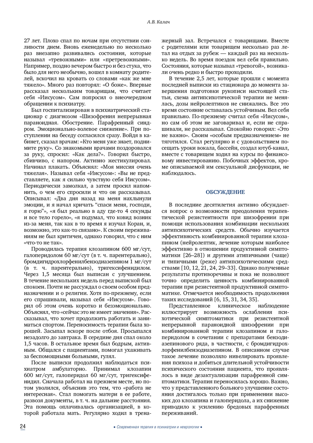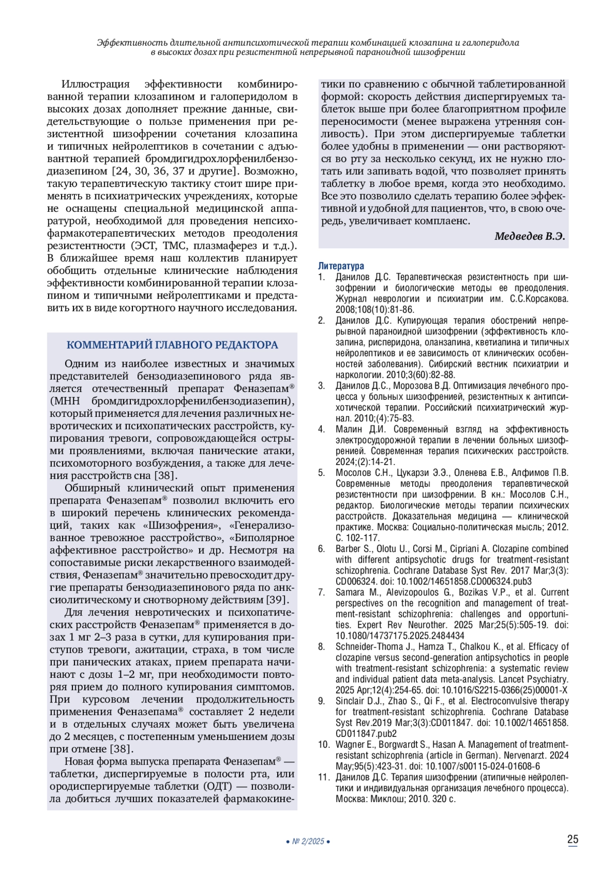 10. 	Wagner E., Borgwardt S., Hasan A. Management of treatment-resistant schizophrenia (article in German). Nervenarzt. 2024 May;95(5):423-31. DOI: 10.1007/s00115-024-01608-6