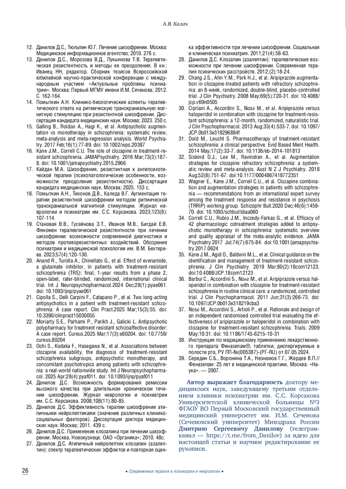 28. 	Данилов Д.С. Клозапин (азалептин): терапевтические возможности при лечении шизофрении. Современная терапия психических расстройств. 2012;(2):18-24.