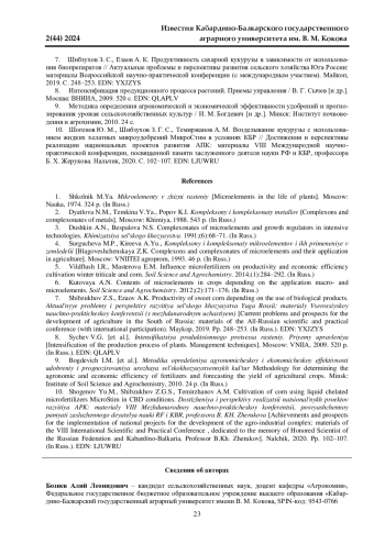 7. 	Шибзухов З. С., Езаов А. К. Продуктивность сахарной кукурузы в зависимости от использования биопрепаратов // Актуальные проблемы и перспективы развития сельского хозяйства Юга России: материалы Всероссийской научно-практической конференции (с международным участием). Майкоп, 2019. С. 248-253. EDN: YXJZYS
