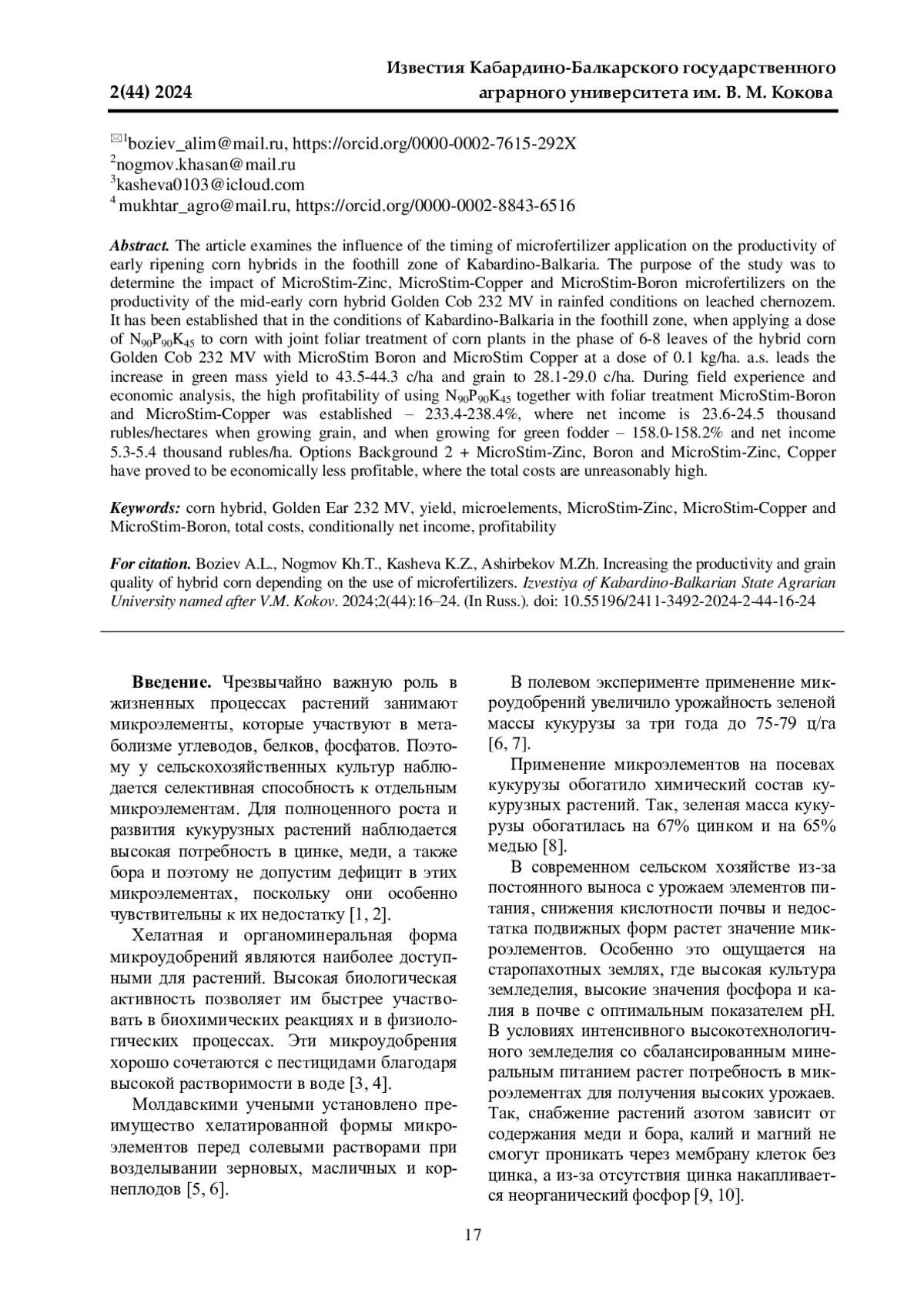 10. 	Шогенов Ю. М., Шибзухов З. Г. С., Темиржанов А. М. Возделывание кукурузы с использованием жидких хелатных микроудобрений МикроСтим в условиях КБР // Достижения и перспективы реализации национальных проектов развития АПК: материалы VIII Международной научно-практической конференции, посвященной памяти заслуженного деятеля науки РФ и КБР, профессора Б. Х. Жерукова. Нальчик, 2020. С. 102-107. EDN: LJUWRU