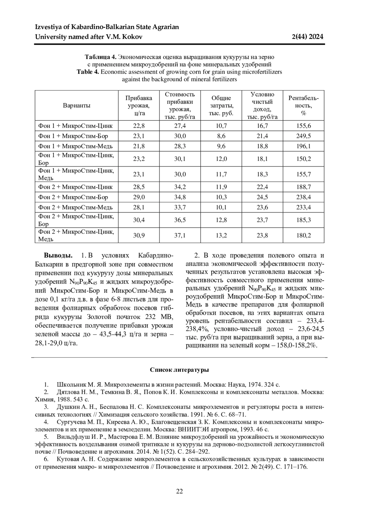 5. 	Вильдфлуш И. Р., Мастерова Е. М. Влияние микроудобрений на урожайность и экономическую эффективность возделывания озимой тритикале и кукурузы на дерново-подзолистой легкосуглинистой почве // Почвоведение и агрохимия. 2014. № 1(52). С. 284-292.