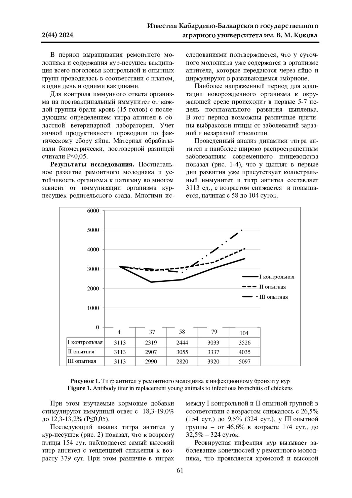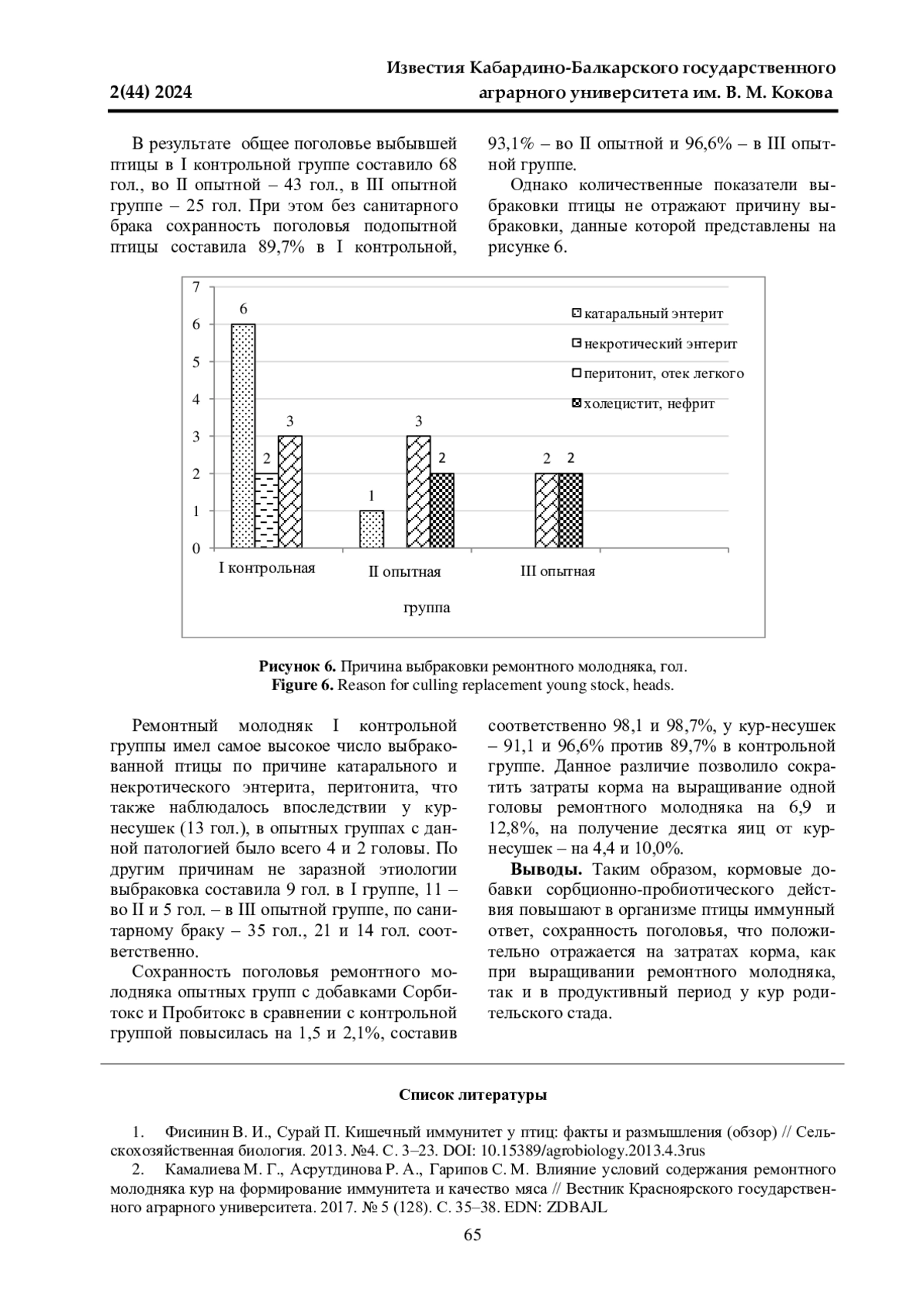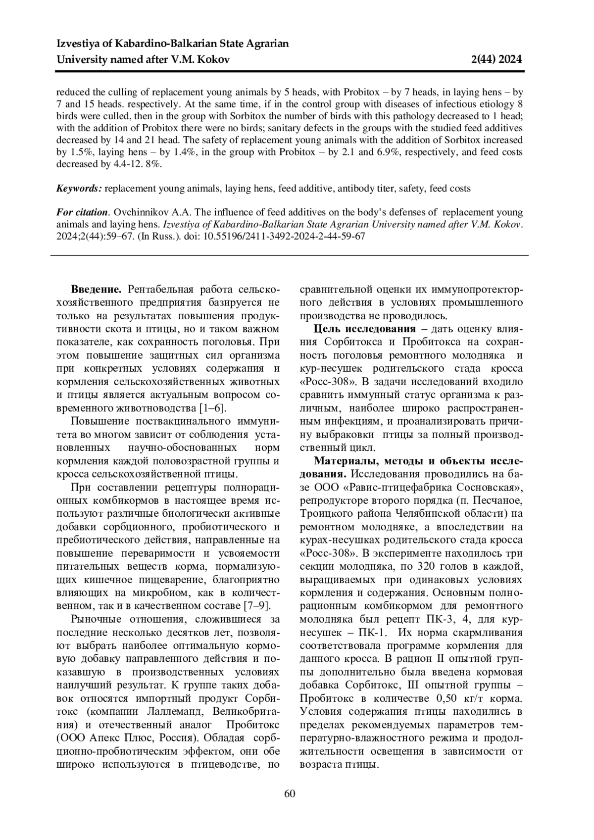 Статья: ВЛИЯНИЕ КОРМОВЫХ ДОБАВОК НА ЗАЩИТНЫЕ СИЛЫ ОРГАНИЗМА РЕМОНТНОГО МОЛОДНЯКА И КУР-НЕСУШЕК (2024)