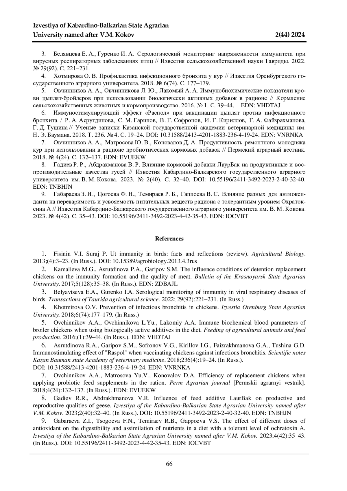 ОВЧИННИКОВ А. А. ВЛИЯНИЕ КОРМОВЫХ ДОБАВОК НА ЗАЩИТНЫЕ СИЛЫ ОРГАНИЗМА РЕМОНТНОГО МОЛОДНЯКА И КУР-НЕСУШЕК // ИЗВЕСТИЯ КАБАРДИНО-БАЛКАРСКОГО ГОСУДАРСТВЕННОГО АГРАРНОГО УНИВЕРСИТЕТА ИМ. В. М. КОКОВА. 2024. № 2 (44)