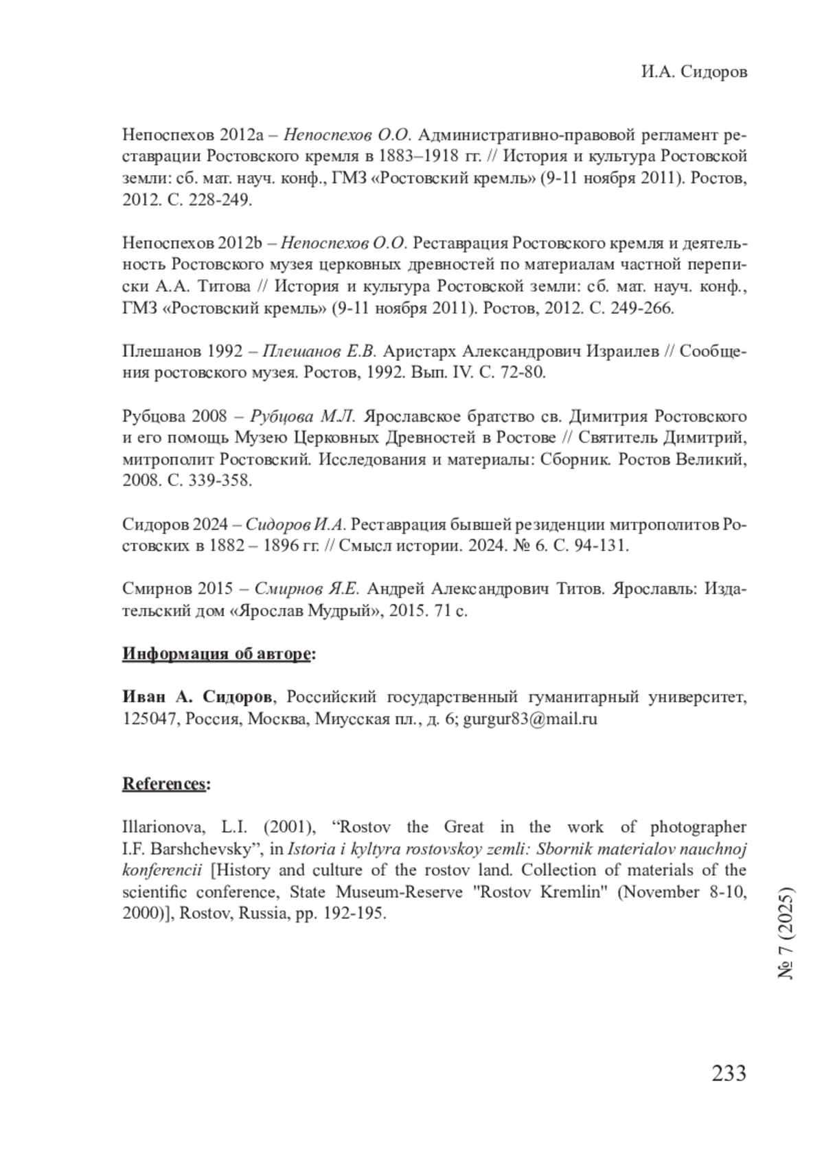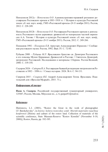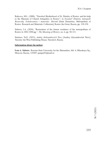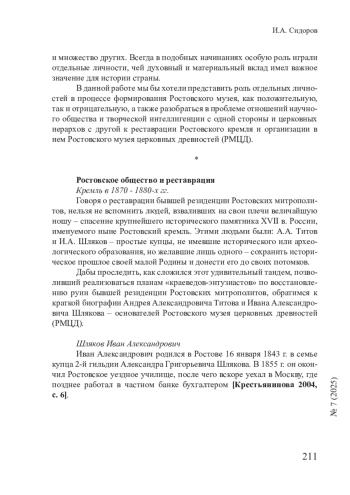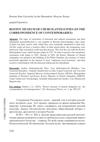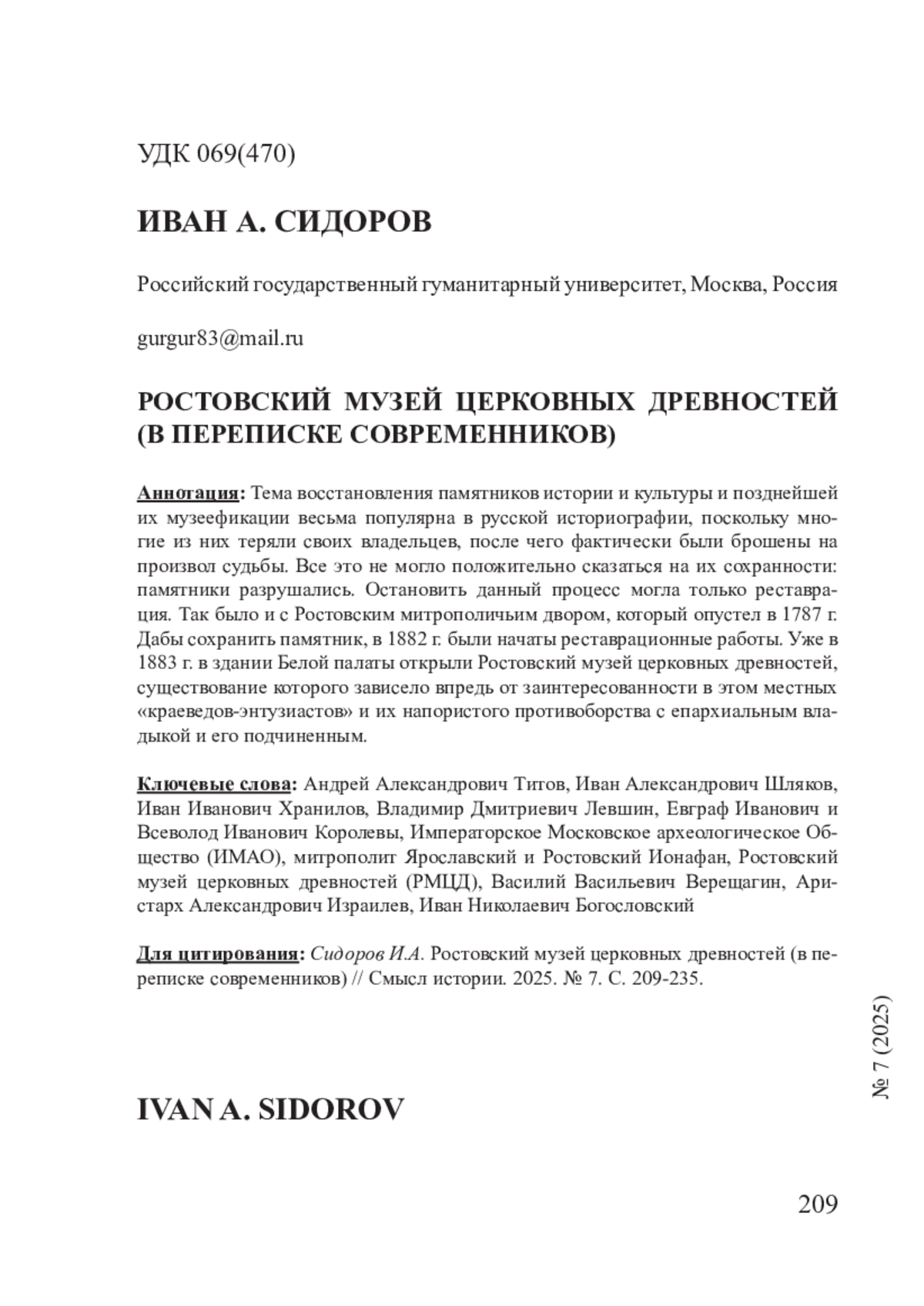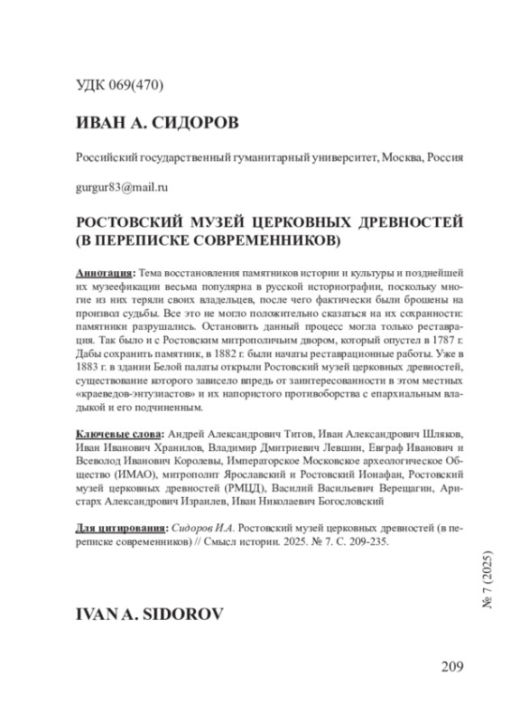 СИДОРОВ И. А. РОСТОВСКИЙ МУЗЕЙ ЦЕРКОВНЫХ ДРЕВНОСТЕЙ (В ПЕРЕПИСКЕ СОВРЕМЕННИКОВ) // СМЫСЛ ИСТОРИИ. 2025. № 7