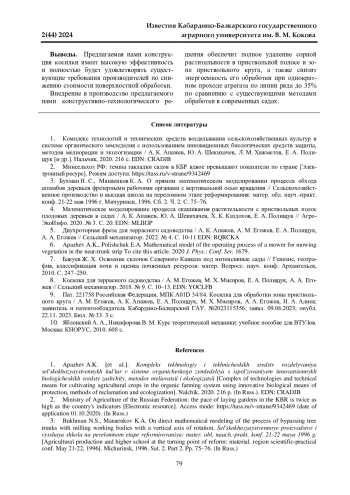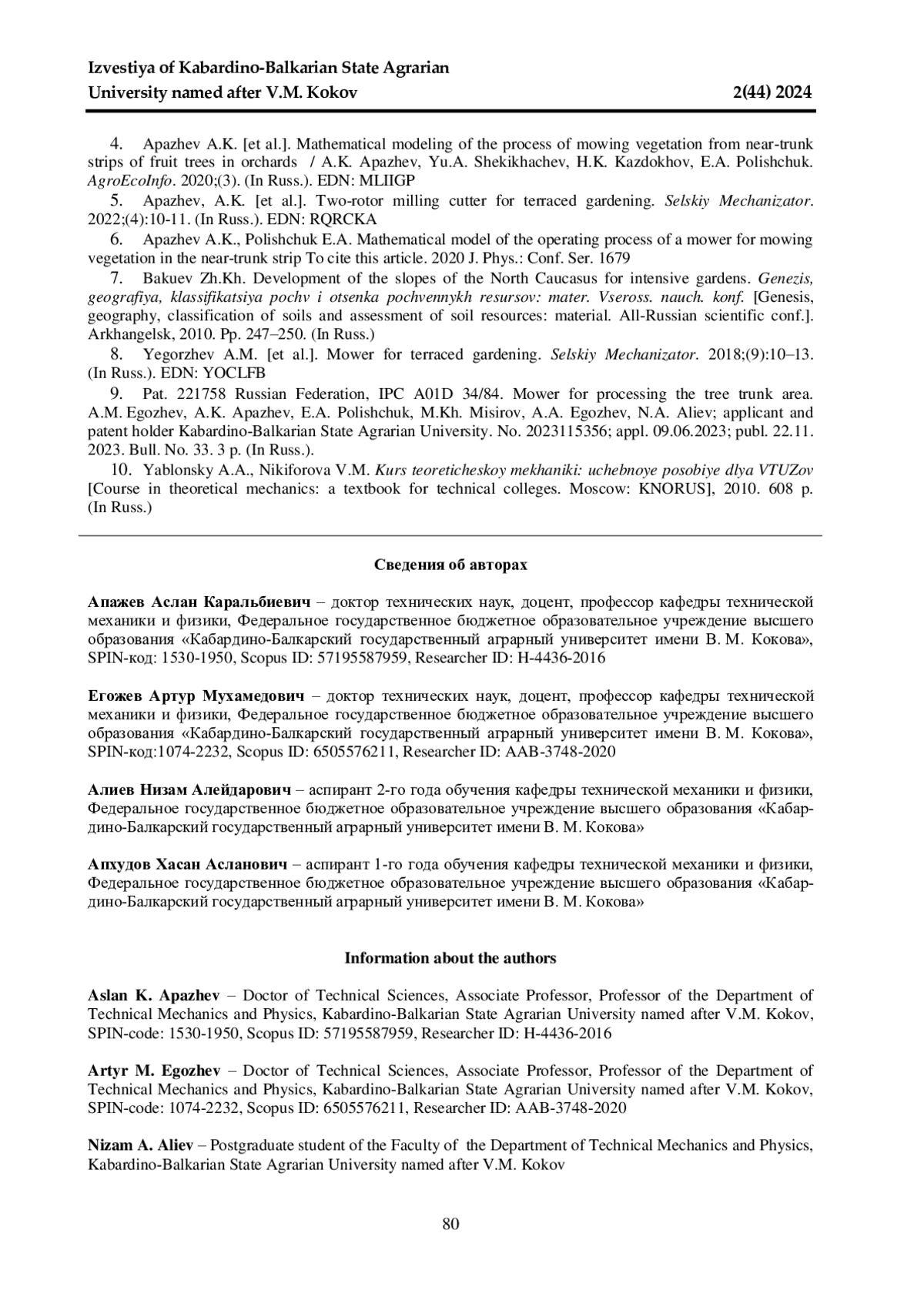 6. Apazhev A.K., Polishchuk E.A. Mathematical model of the operating process of a mower for mowing vegetation in the near-trunk strip To cite this article. 2020 J. Phys.: Conf. Ser. 1679. EDN: ZDQODU