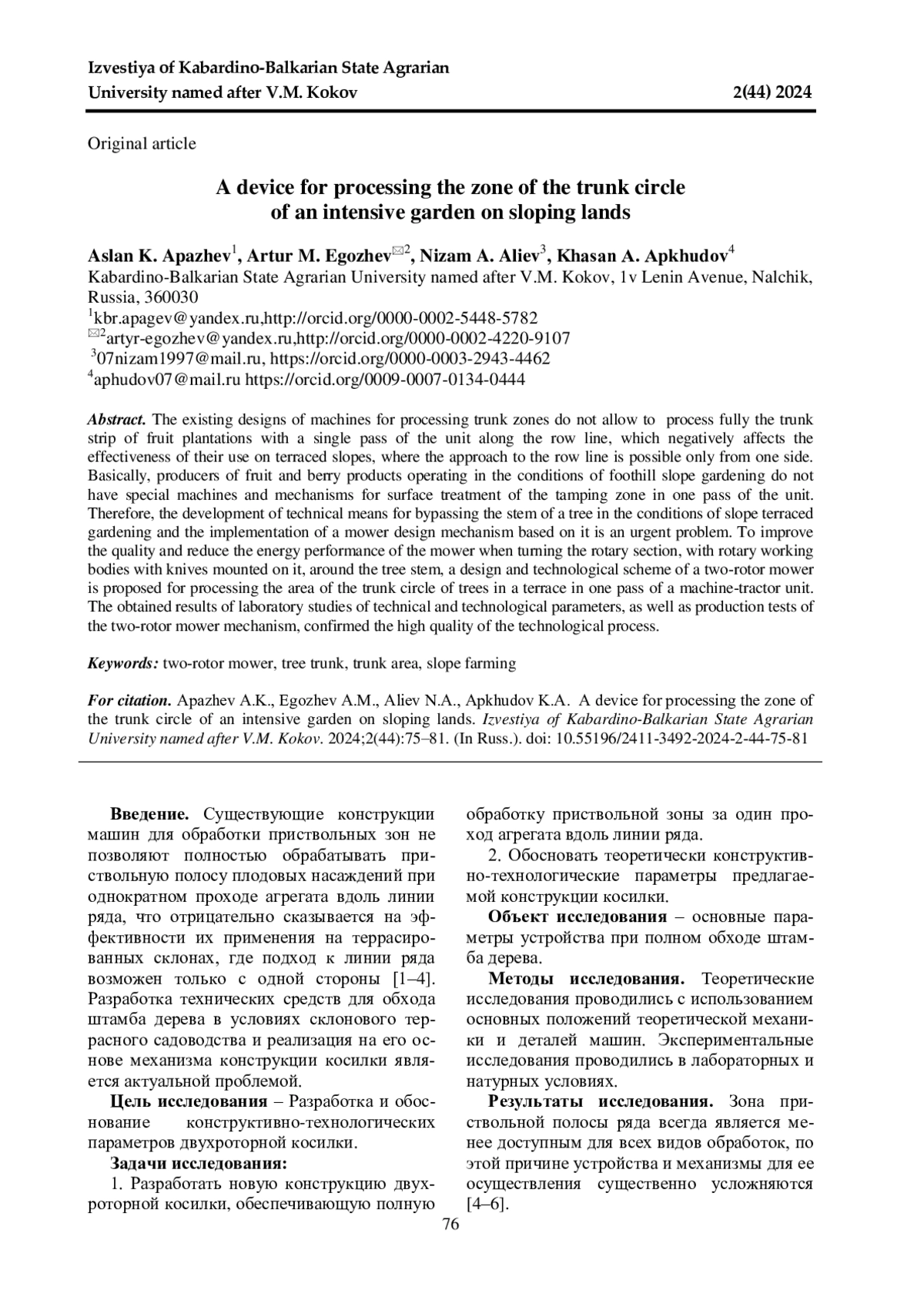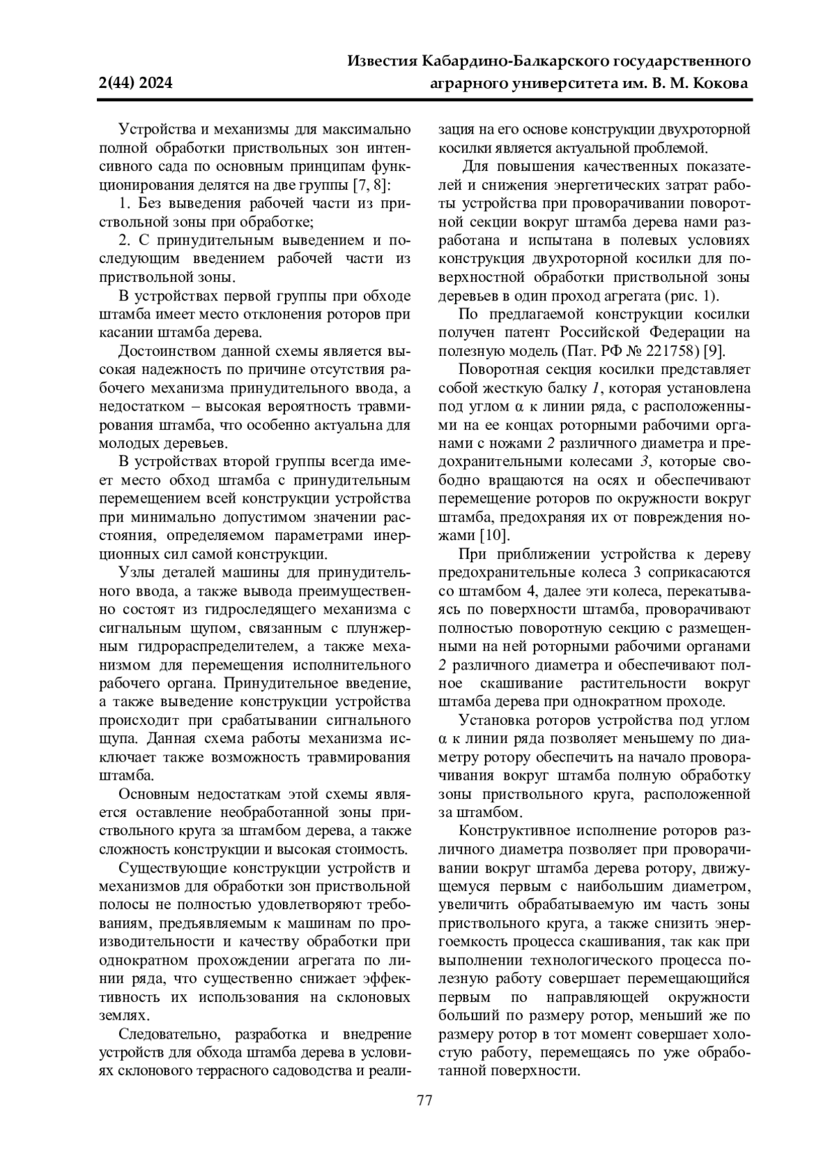 Существующие конструкции машин для обработки приствольных зон не позволяют полностью обрабатывать приствольную полосу плодовых насаждений при однократном проходе агрегата вдоль линии ряда, что отрицательно сказывается на эффективности их применения на террасированных склонах, где подход к линии ряда возможен только с одной стороны. В основном, производители плодово-ягодной продукции, осуществляющие свою деятельность в условиях предгорного склонового садоводства, не имеют специальных машин и механизмов для поверхностной обработки приштамбовой зоны в один проход агрегата. Следовательно, разработка технических средств для обхода штамба дерева в условиях склонового террасного садоводства и реализация на его основе механизма конструкции косилки является актуальной проблемой. Для повышения качественных показателей работы и снижения энергетических затрат работы устройства при проворачивании поворотной секции с установленными на ней роторными рабочими органами с ножами вокруг штамба дерева предлагается конструктивно-технологическая схема двухроторной косилки для обработки зоны приствольного круга деревьев в условиях террасы за один проход машинотракторного агрегата. Полученные результаты лабораторных исследований технических и технологических параметров, а также производственных испытаний механизма двухроторной косилки подтвердили высокое качество выполнения технологического процесса.