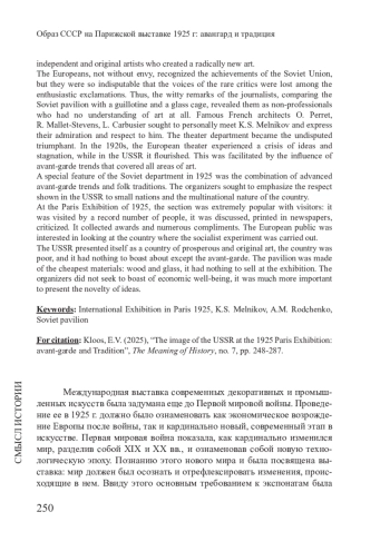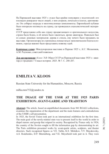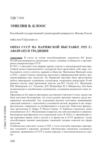В 1925 г. Советский Союз впервые принял участие в международной выставке. Главной целью новоиспеченного государства было представить себя миру, чтобы развеять слухи и сплетни, царящие в обществе. Признанная Францией лишь в 1924 г. страна Советов стремилась восполнить информационный пробел, продемонстрировав свое искусство. На Парижской выставке были представлены работы авангардных художников, скульпторов, театральных режиссеров. В ней приняли участие такие признанные деятели, как В. Е. Татлин, К. С. Мельников, В. В. Маяковский, А. С. Родченко, Д. П. Штеренберг, В. Э. Мейерхольд. Они были независимыми и самобытными художниками, создавшими радикально новое искусство.