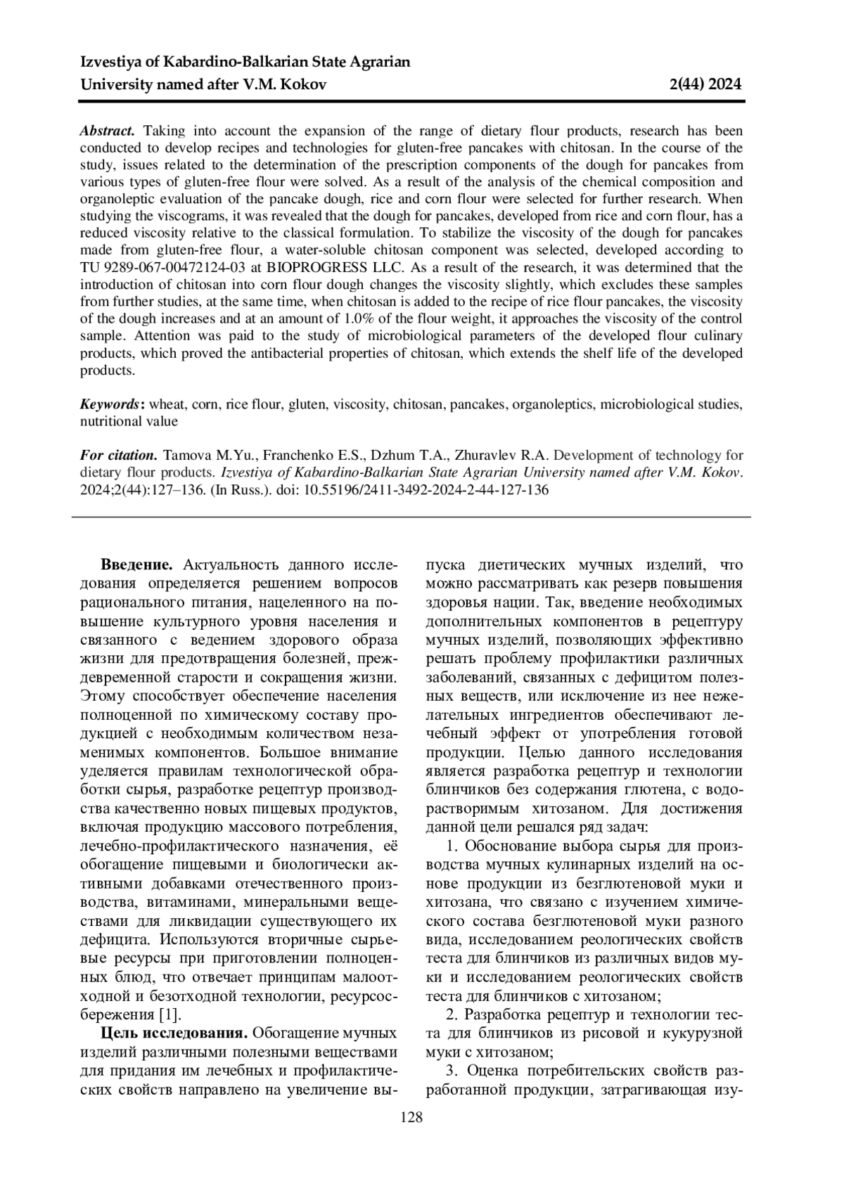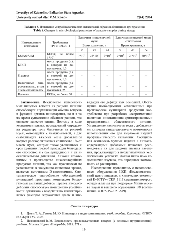 С учетом расширения ассортимента диетических мучных изделий, проведены исследования с целью разработки рецептур и технологий теста для блинчиков без содержания глютена, с хитозаном. В процессе исследования решались вопросы, связанные с определением рецептурных компонентов теста для блинчиков из различных видов безглютеновой муки. В результате анализа химического состава и органолептической оценки теста для блинчиков, для дальнейших исследований была выбрана рисовая и кукурузная мука. При изучении вискограмм выявлено, что тесто для блинчиков, разработанное из рисовой и кукурузной муки, имеет пониженную, относительно классической рецептуры, вязкость. Для стабилизации вязкости теста для блинчиков из безглютеновых видов муки был выбран компонент хитозан водорастворимый, выработанный по ТУ 9289-067-00472124-03 на ООО «Биопрогресс». В результате исследования определено, что внесение хитозана в тесто из кукурузной муки меняет вязкость незначительно, что исключает данные образцы из дальнейших исследований, в то же время при внесении хитозана в рецептуру блинчиков из муки рисовой вязкость теста возрастает и при количестве 1,0% от массы муки, приближается к вязкости контрольного образца. Уделялось внимание исследованию микробиологических показателей разработанных мучных кулинарных изделий, которое доказало антибактериальные свойства хитозана, что удлиняет срок хранения разработанных изделий.
