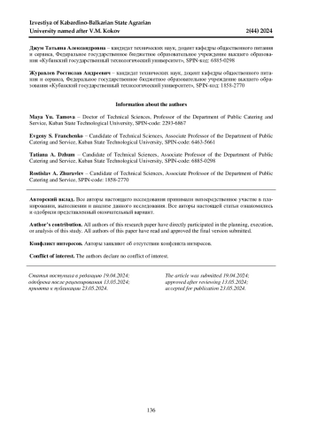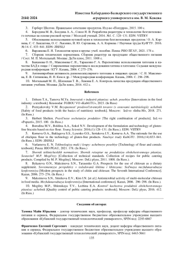 1. 	Джум Т. А., Тамова М. Ю. Инновации в индустрии питания: учеб. пособие. Краснодар: ФГБОУ ВО “КубГТУ”, 2023. EDN: QZIPJH