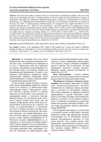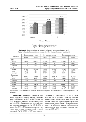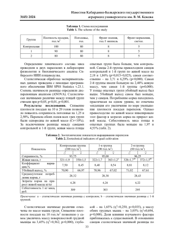 Рынок мяса перепелов основывается на использовании мясных пород в промышленных условиях. Цель исследования - изучить влияние плотности посадки на живую массу и мясную продуктивность перепелов мясных пород. Исследование выполнено на перепелах породы радонежские в возрасте 1-49 дней жизни при плотности посадки 10, 90 и 80 голов на 1 м 2. Снижение плотности посадки перепелов на 10 и 20 голов позволило повысить сохранность птицы на 1,25-2,50%. Плотность посадки 90 голов на 1 м 2 повысило живую массу самок на 3,71% (p<0,05), 80 голов на 1 м2 - самцов на 2,18% и самок - на 6,29% (p<0,05). Рост живой массы тесно связан с увеличением массы поверхностной грудной мышцы (r=0,875÷0,998, р<0,05), которая находилась в зависимости от длины киля (r=0,630÷0,659, p<0,01). На содержание белка в мышцах в большей степени повлиял пол птицы, а не изменение плотности посадки (η2 пол=0,394÷0,593, р=0,025÷0,005; η2 группа=0,082÷0,191, р=0,408÷0,284). На содержание липидов в мышцах оказывали влияние оба фактора (пол и плотность посадки), хотя влияние плотности посадки было превалирующим. Снижение плотности посадки с соблюдением норм фронта поения и кормления не увеличило потребление корма. За счет большей сохранности и убойного выхода себестоимость производства мяса перепелов удалось снизить на 1,97-4,53%.