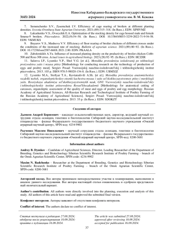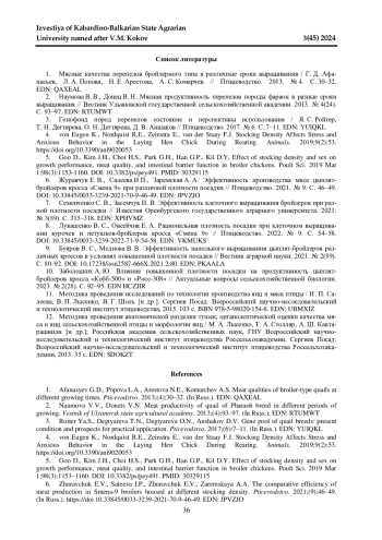 9. 	Буяров В. С., Меднова В. В. Эффективность напольного выращивания цыплят-бройлеров различных кроссов в условиях повышенной плотности посадки // Вестник аграрной науки. 2021. № 2(89). С. 80-92. DOI: 10.17238/issn2587-666X.2021.2.80 EDN: PKAALA