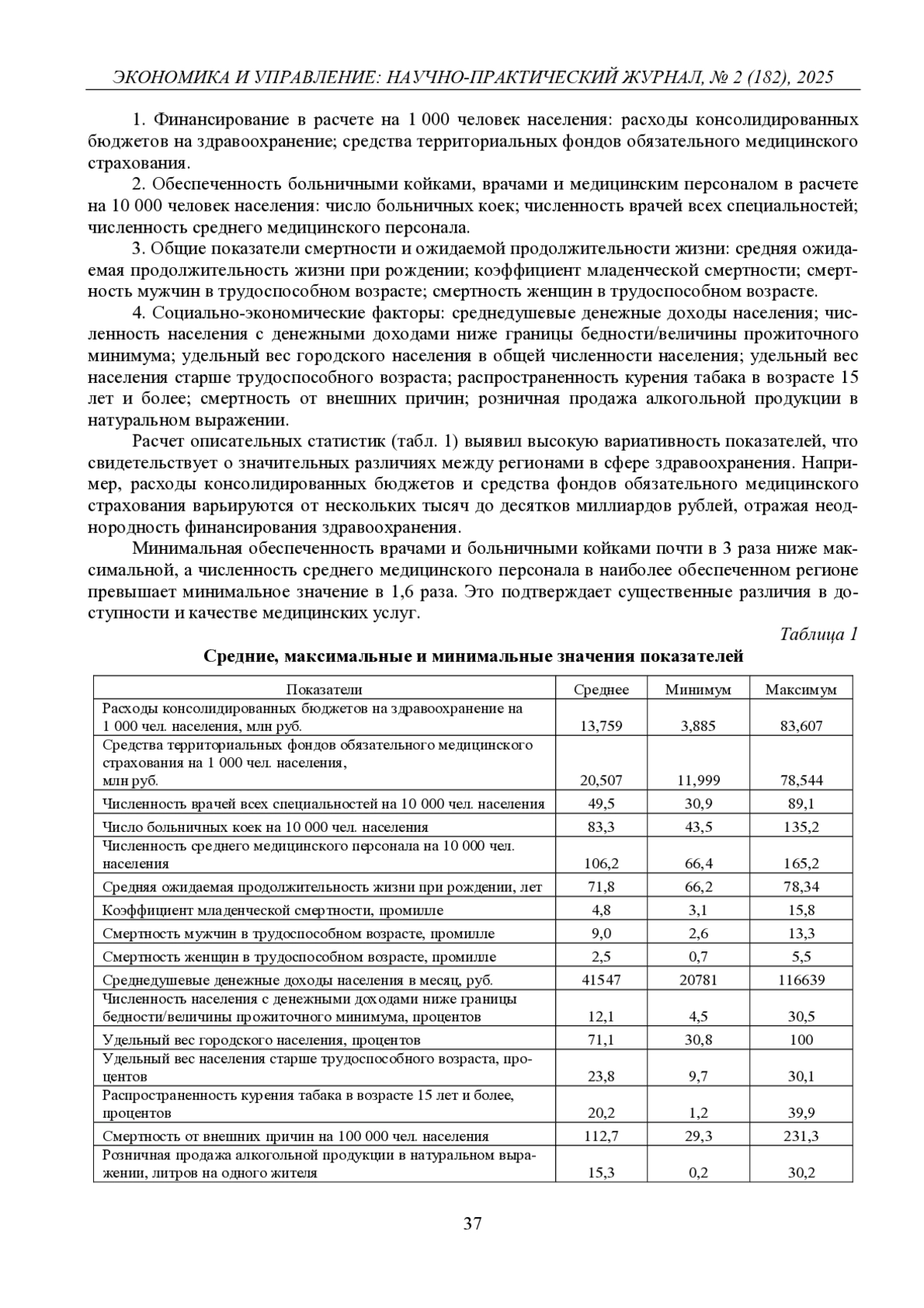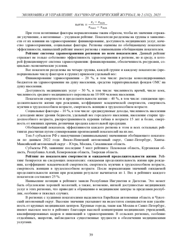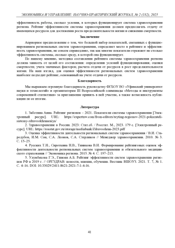 ЖИТНИКОВ И. В., ЛУЦЕНКО А. А., БАБЕНКО Е. В., ФАВАРИСОВА Е. Л. РЕЙТИНГОВАЯ ОЦЕНКА ЭФФЕКТИВНОСТИ СИСТЕМ ЗДРАВООХРАНЕНИЯ РЕГИОНОВ РОССИЙСКОЙ ФЕДЕРАЦИИ // ЭКОНОМИКА И УПРАВЛЕНИЕ: НАУЧНО-ПРАКТИЧЕСКИЙ ЖУРНАЛ. 2025. № 2 (182)