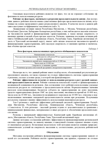 В статье построены рейтинги регионов по эффективности систем здравоохранения, представляющие собой инструмент объективной оценки и сравнительного анализа работы субъектов РФ в этой сфере. Определены факторы эффективности региональных систем здравоохранения и количественно оценена степень их влияния