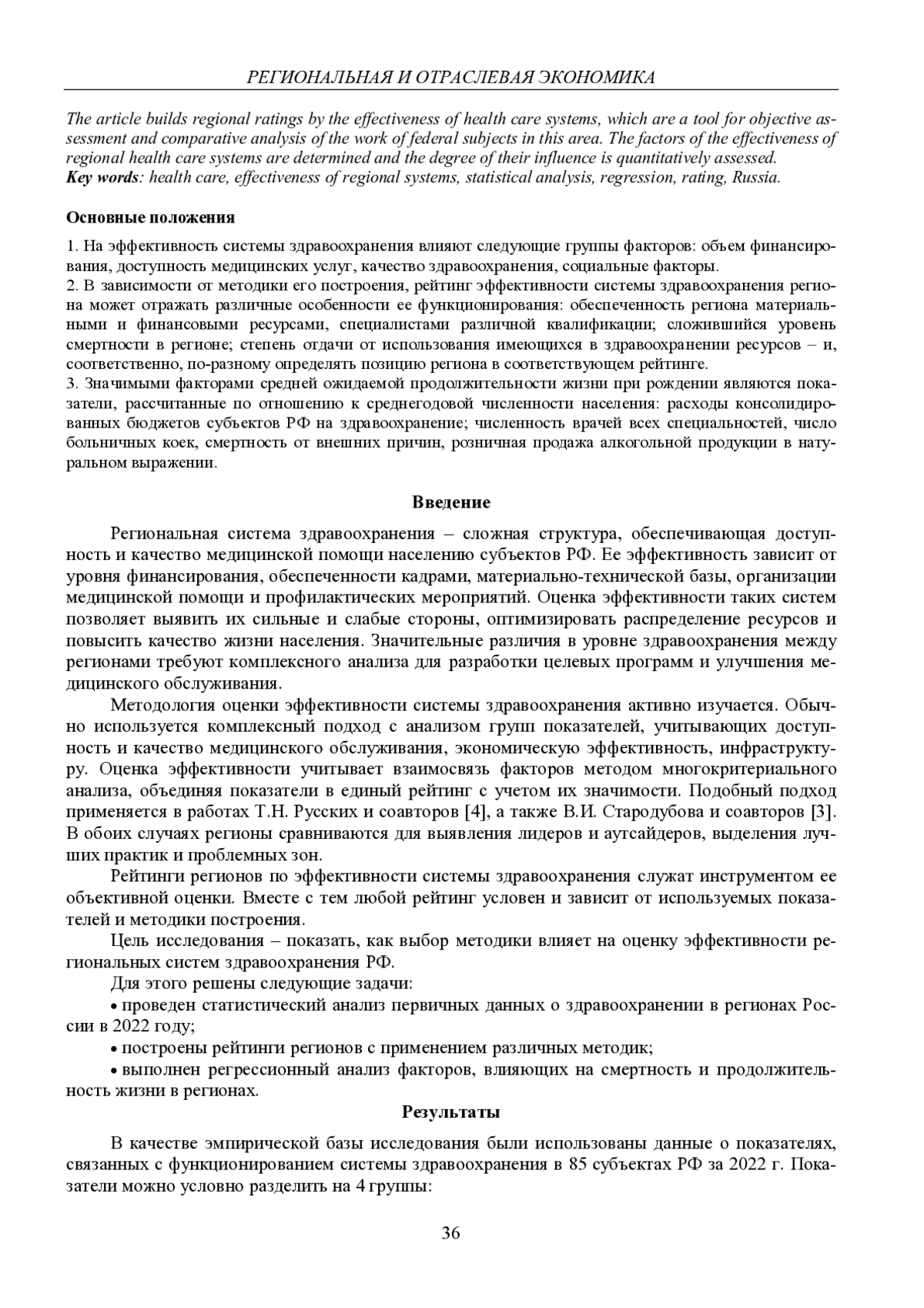 Ключевые фразы: здравоохранение, эффективность региональных систем, статистический анализ, регрессия, рейтинг, Россия