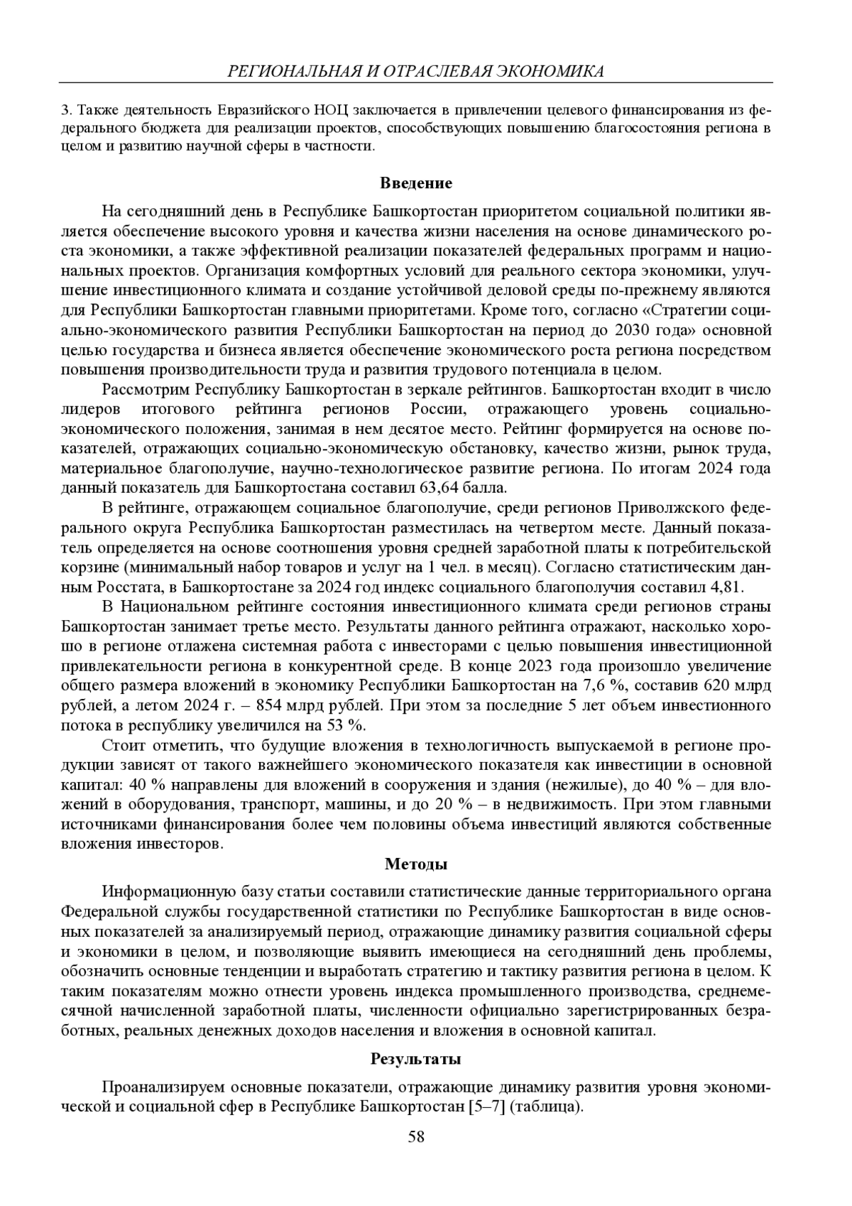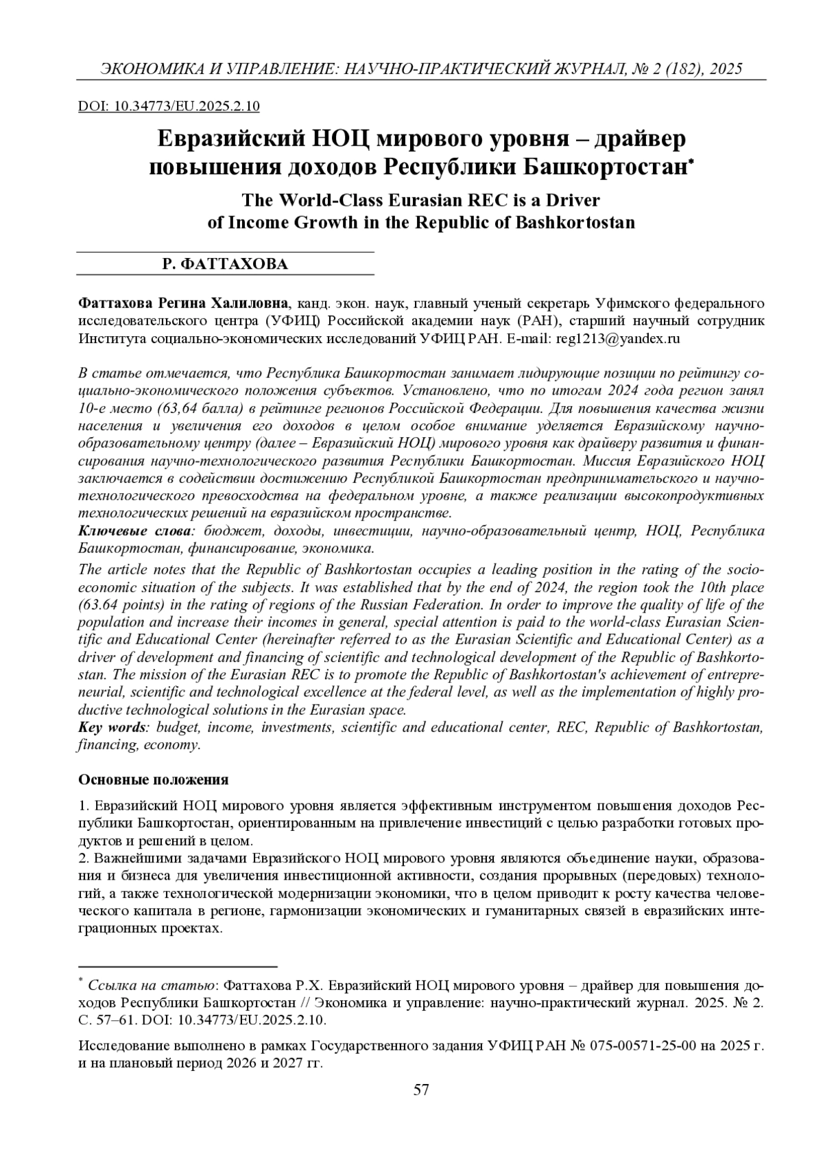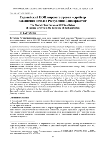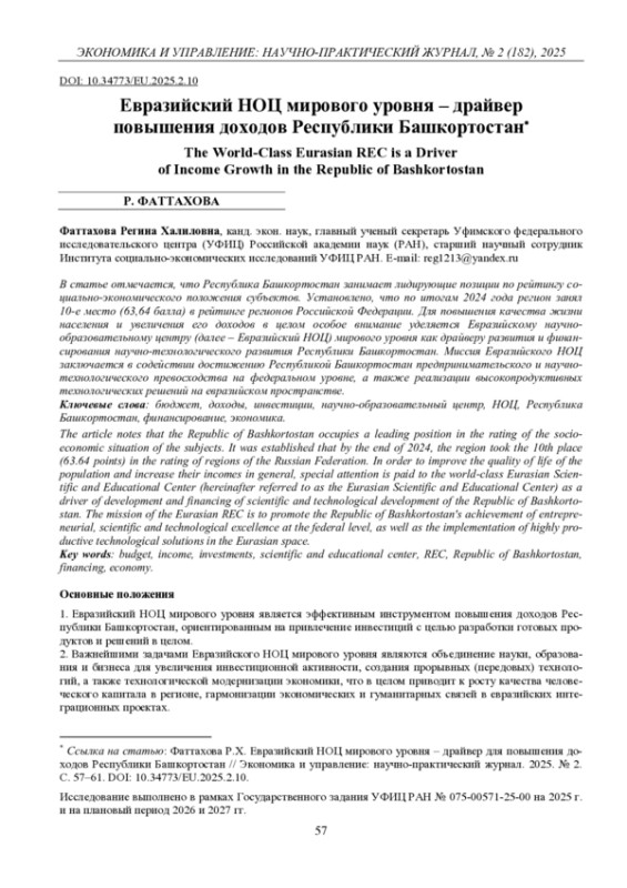 В статье отмечается, что Республика Башкортостан занимает лидирующие позиции по рейтингу социально-экономического положения субъектов. Установлено, что по итогам 2024 года регион занял 10-е место (63,64 балла) в рейтинге регионов Российской Федерации. Для повышения качества жизни населения и увеличения его доходов в целом особое внимание уделяется Евразийскому научнообразовательному центру (далее – Евразийский НОЦ) мирового уровня как драйверу развития и финансирования научно-технологического развития Республики Башкортостан. Миссия Евразийского НОЦ заключается в содействии достижению Республикой Башкортостан предпринимательского и научнотехнологического превосходства на федеральном уровне, а также реализации высокопродуктивных технологических решений на евразийском пространстве