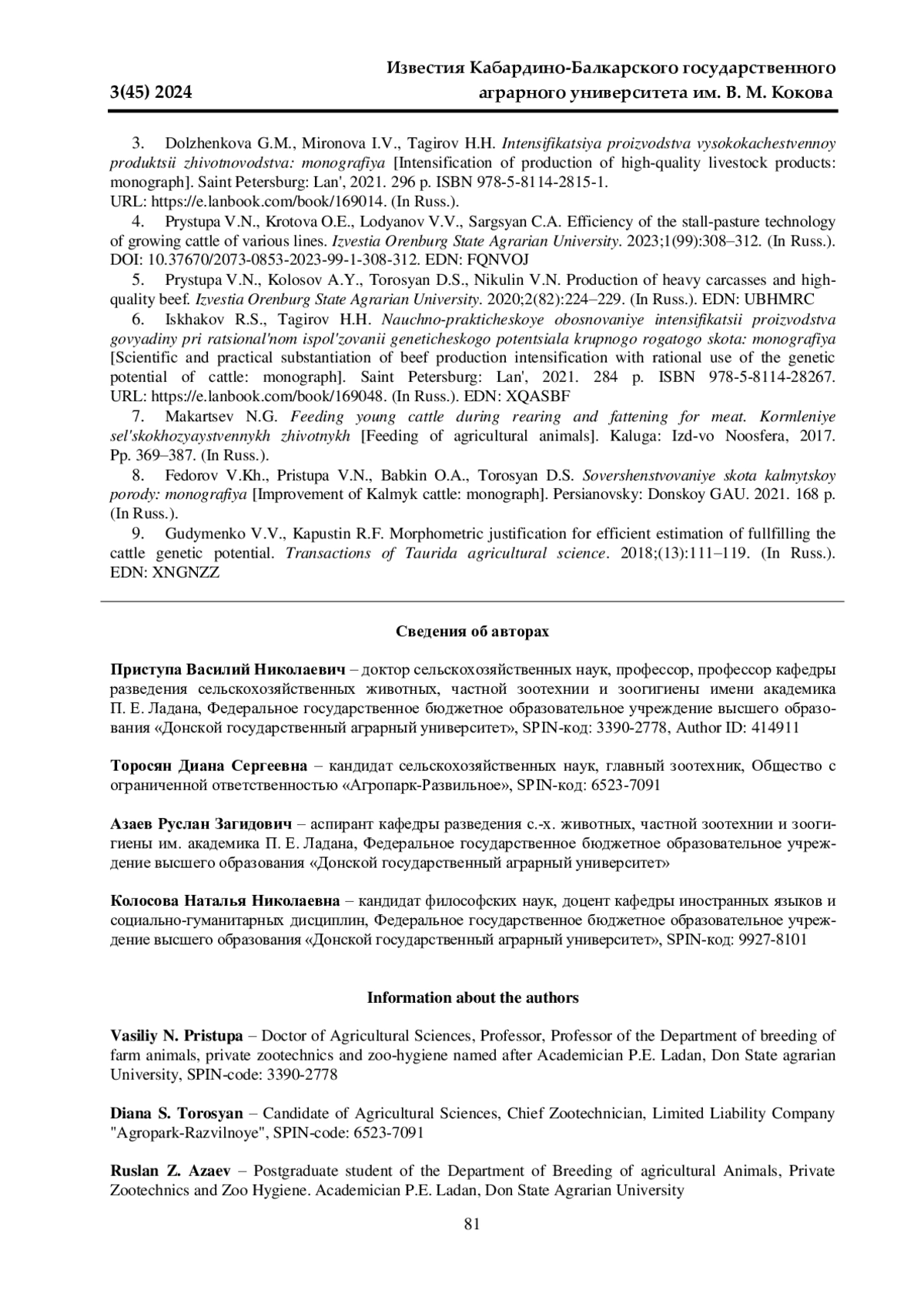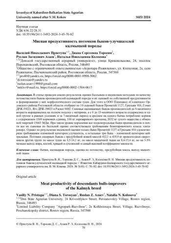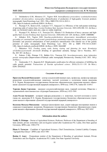 ПРИСТУПА В. Н., ТОРОСЯН Д. С., АЗАЕВ Р. З., КОЛОСОВА Н. Н. МЯСНАЯ ПРОДУКТИВНОСТЬ ПОТОМКОВ БЫКОВ-УЛУЧШАТЕЛЕЙ КАЛМЫЦКОЙ ПОРОДЫ // ИЗВЕСТИЯ КАБАРДИНО-БАЛКАРСКОГО ГОСУДАРСТВЕННОГО АГРАРНОГО УНИВЕРСИТЕТА ИМ. В. М. КОКОВА. 2024. № 3 (45)