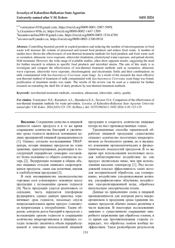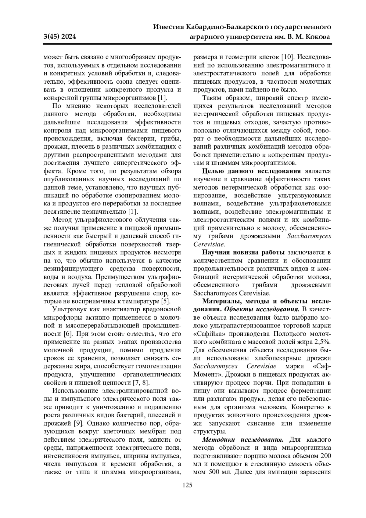 Контроль роста бактерий в продуктах с истекающим сроком годности и сокращение количества микроорганизмов в пищевых отходах позволит увеличить объем перерабатываемой и повторно используемой пищевой продукции и сократить количество пищевых потерь. Ряд исследований показал эффективность методов нетермической обработки пищевой продукции и пищевых отходов. В то же время широкий спектр имеющихся исследований зачастую демонстрирует противоположные результаты, что говорит о необходимости дополнительных исследований применительно к конкретным пищевым продуктам и штаммам микроорганизмов. Целью данного исследования является изучение и сравнение эффективности таких методов нетермической обработки, как озонирование, воздействие ультразвуковыми волнами, воздействие ультрафиолетовыми волнами, воздействие электромагнитным и электростатическим полями и их комбинаций применительно к молоку, обсемененному грибами дрожжевыми Saccharomyces Cerevisiae. В результате исследования был установлен наиболее эффективный нетермический метод обработки молока, обсемененного грибами дрожжевыми Saccharomyces Cerevisiae, выполнено обоснование режимов обработки. Результаты обзора могут быть использованы в качестве материала для дальнейших исследований по продлению срока годности молочных продуктов нетермическими методами обработки.