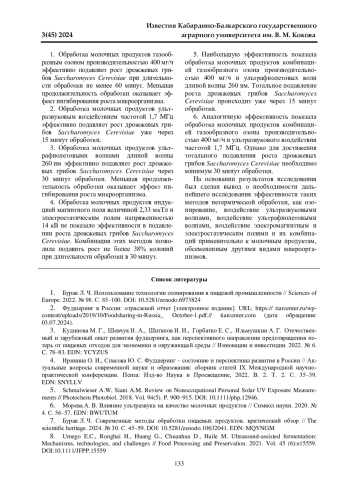 8. 	Umego E.C., Ronghai H., Huang G., Chuanhua D., Haile M. Ultrasound-assisted fermentation: Mechanisms, technologies, and challenges // Food Processing and Preservation. 2021. Vol. 45 (6):e15559. DOI: 10.1111/JFPP.15559 EDN: UPAVOS