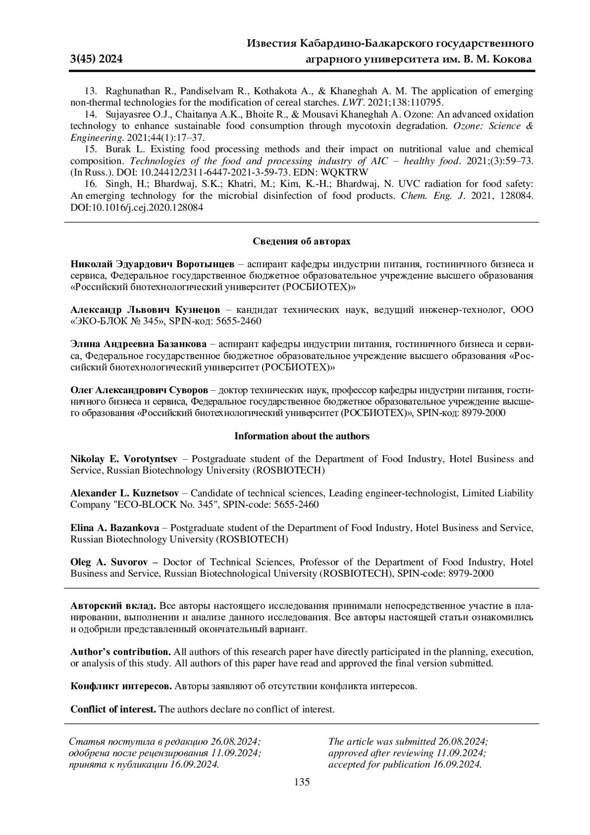 13. 	Raghunathan R., Pandiselvam R., Kothakota A., & Khaneghah A. M. The application of emerging non-thermal technologies for the modification of cereal starches. LWT. 2021. Vol. 138. P. 110795.