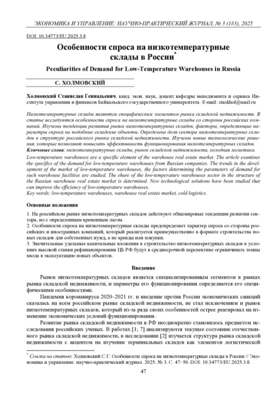 ХОЛМОВСКИЙ С. Г. ОСОБЕННОСТИ СПРОСА НА НИЗКОТЕМПЕРАТУРНЫЕ СКЛАДЫ В РОССИИ // ЭКОНОМИКА И УПРАВЛЕНИЕ: НАУЧНО-ПРАКТИЧЕСКИЙ ЖУРНАЛ. 2025. № 3 (183)
