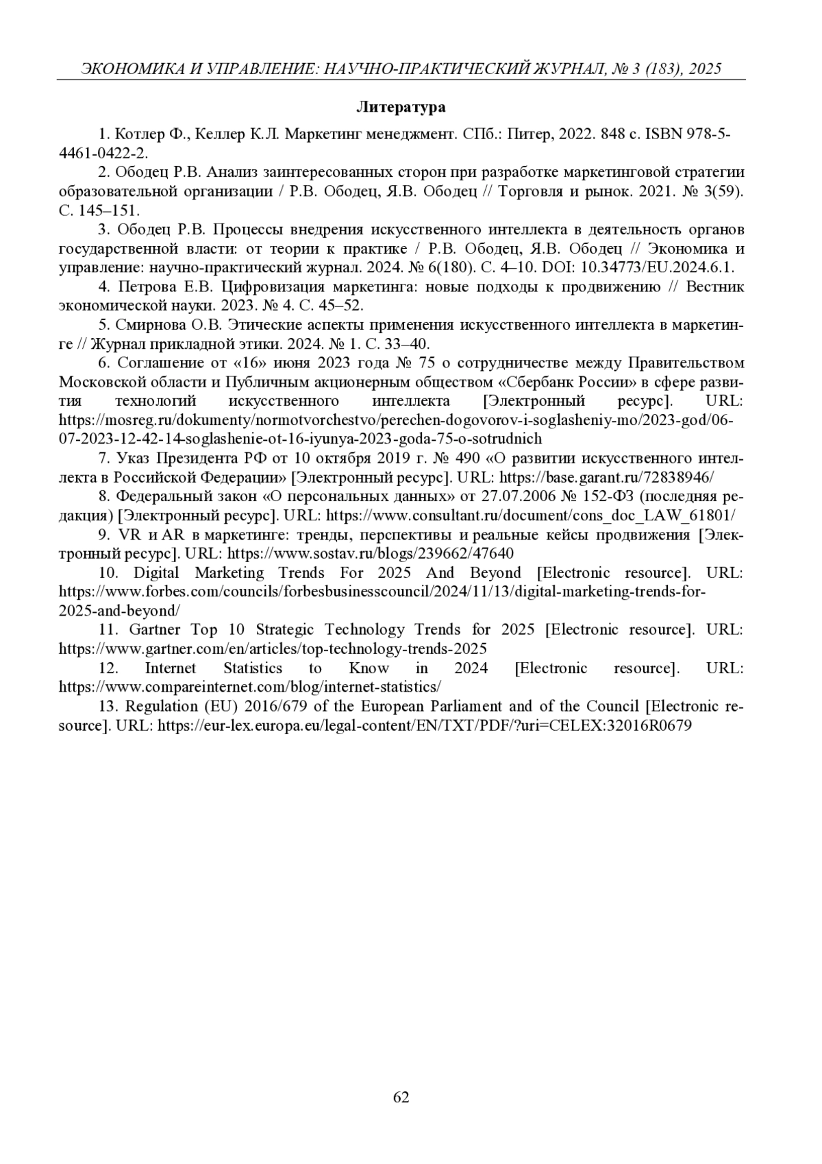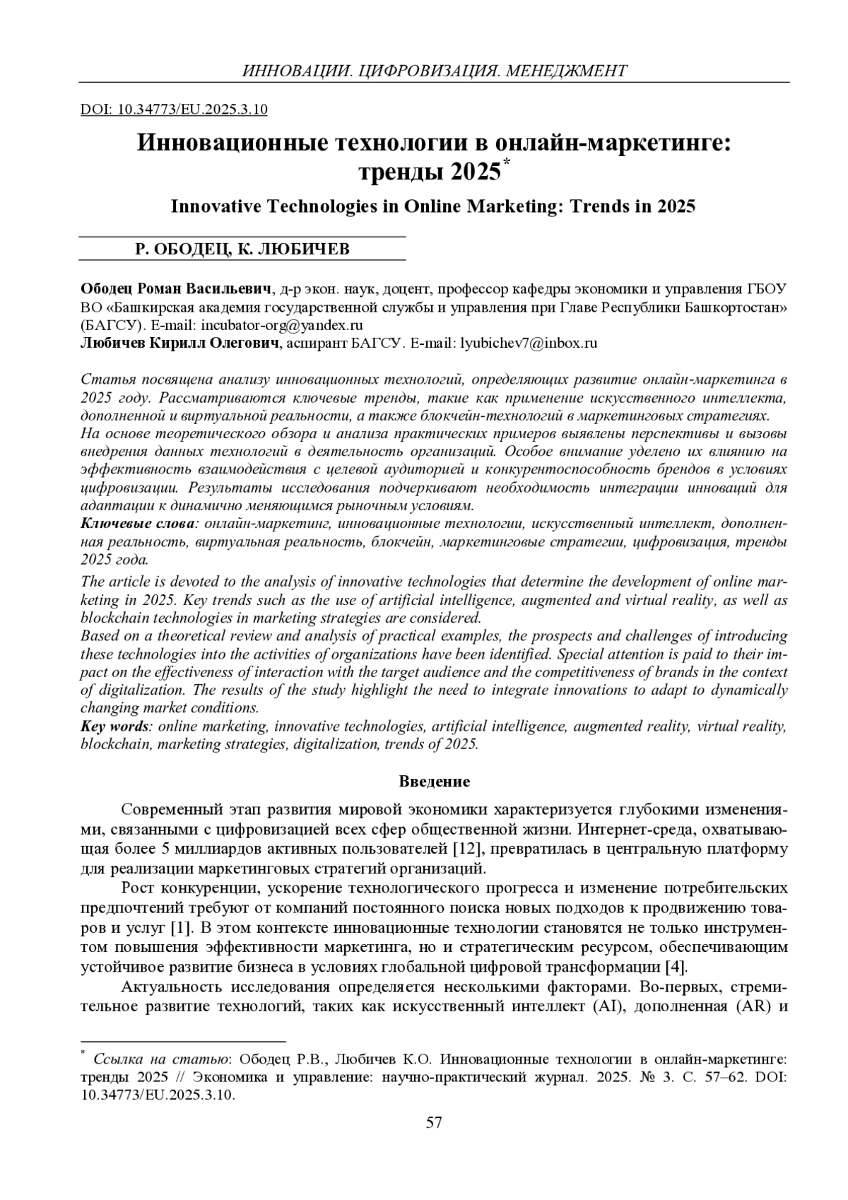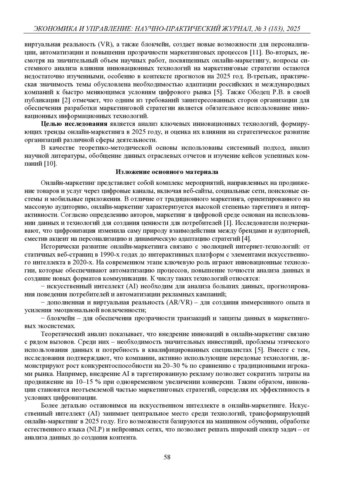 ОБОДЕЦ Р. В., ЛЮБИЧЕВ К. О. ИННОВАЦИОННЫЕ ТЕХНОЛОГИИ В ОНЛАЙН-МАРКЕТИНГЕ: ТРЕНДЫ 2025 // ЭКОНОМИКА И УПРАВЛЕНИЕ: НАУЧНО-ПРАКТИЧЕСКИЙ ЖУРНАЛ. 2025. № 3 (183)