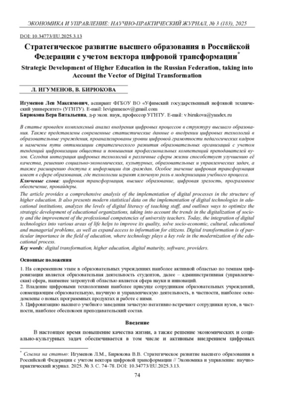 В настоящее время повышение качества жизни, а также решение экономических и социально-культурных задач обеспечивается в том числе и активным внедрением цифровых технологий во все сферы жизни общества. Особую роль цифровизация играет в образовании. Начиная с 1980-х годов информационно-коммуникационные технологии активно используются в управлении вузами и учебным процессом, что приводит к значительным изменениям в системе образования