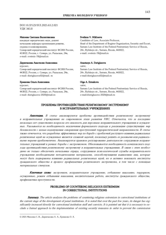 4. 	Михеева С. В. Некоторые вопросы религиозного экстремизма в пенитенциарных учреждениях России // Правовая культура в современном обществе: сборник научных работ. Могилев, 2019. С. 294-297. EDN: WGDGPA