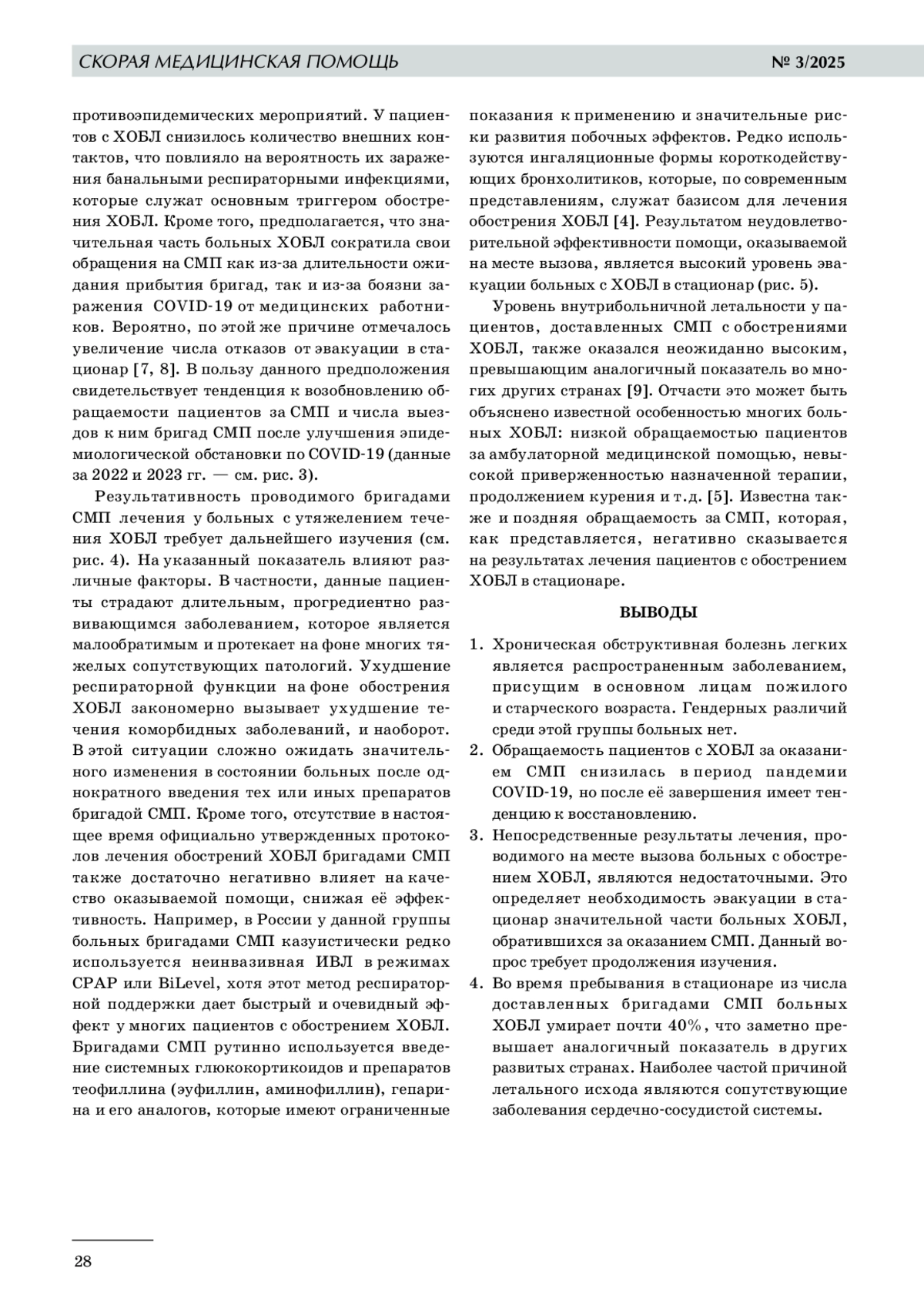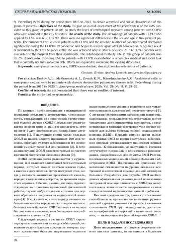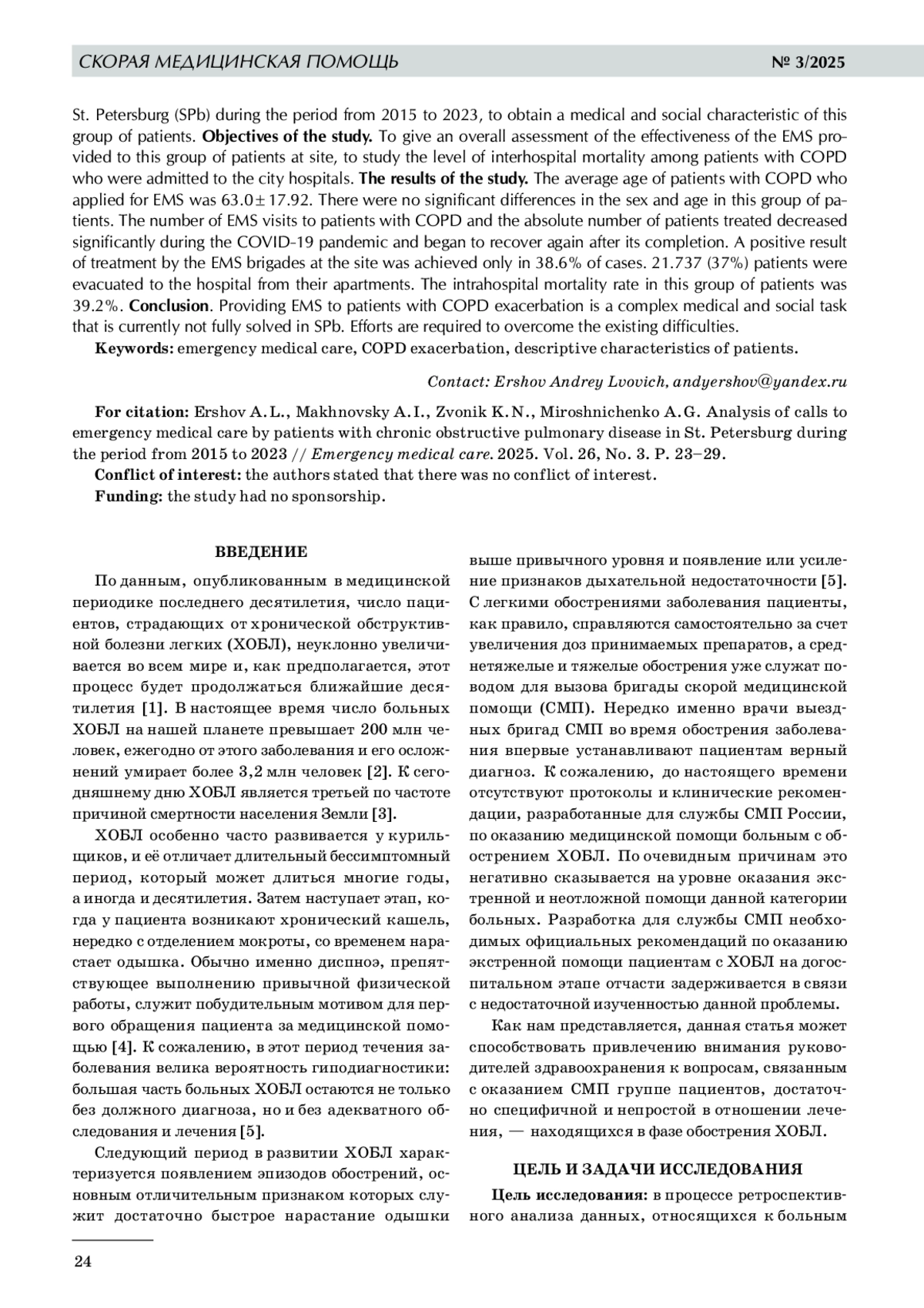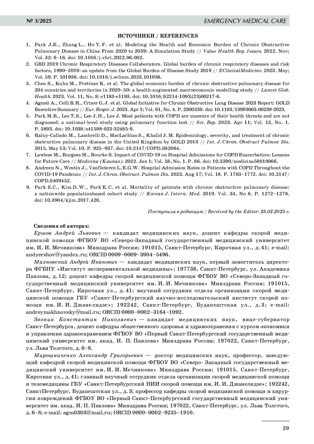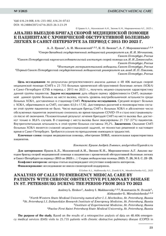 ЕРШОВ А. Л., МАХНОВСКИЙ А. И., ЗВОНИК К. Н., МИРОШНИЧЕНКО А. Г. АНАЛИЗ ВЫЕЗДОВ БРИГАД СКОРОЙ МЕДИЦИНСКОЙ ПОМОЩИ К ПАЦИЕНТАМ С ХРОНИЧЕСКОЙ ОБСТРУКТИВНОЙ БОЛЕЗНЬЮ ЛЕГКИХ В САНКТ-ПЕТЕРБУРГЕ ЗА ПЕРИОД С 2015 ПО 2023 Г. // СКОРАЯ МЕДИЦИНСКАЯ ПОМОЩЬ. 2025. № 3, ТОМ 26