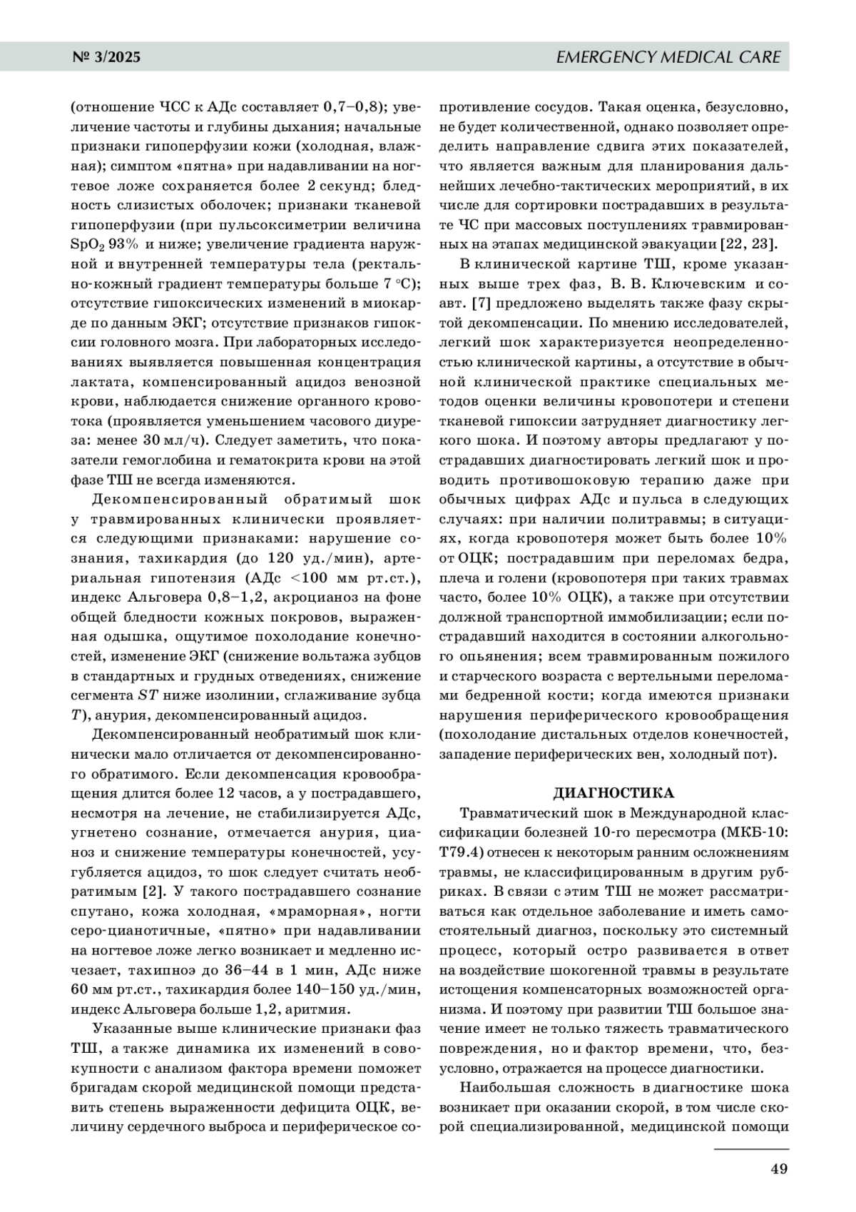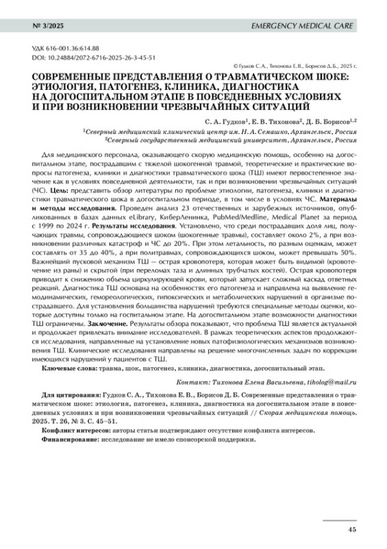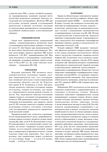 Для медицинского персонала, оказывающего скорую медицинскую помощь, особенно на догоспитальном этапе, пострадавшим с тяжелой шокогенной травмой, теоретические и практические вопросы патогенеза, клиники и диагностики травматического шока (ТШ) имеют первостепенное значение как в условиях повседневной деятельности, так и при возникновении чрезвычайных ситуаций (ЧС). Цель: представить обзор литературы по проблеме этиологии, патогенеза, клиники и диагностики травматического шока в догоспитальном периоде, в том числе в условиях ЧС. Материалы и методы исследования. Проведен анализ 23 отечественных и зарубежных источников, опубликованных в базах данных eLibrary, КиберЛенинка, PubMed/Medline, Medical Planet за период с 1999 по 2024 г. Результаты исследования. Установлено, что среди пострадавших доля лиц, получающих травмы, сопровождающиеся шоком (шокогенные травмы), составляет около 2%, а при возникновении различных катастроф и ЧС до 20%. При этом летальность, по разным оценкам, может составлять от 35 до 40%, а при политравмах, сопровождающихся шоком, может превышать 50%. Важнейший пусковой механизм ТШ — острая кровопотеря, которая может быть видимой (кровотечение из раны) и скрытой (при переломах таза и длинных трубчатых костей). Острая кровопотеря приводит к снижению объема циркулирующей крови, который запускает сложный каскад ответных реакций. Диагностика ТШ основана на особенностях его патогенеза и направлена на выявление гемодинамических, гемореологических, гипоксических и метаболических нарушений в организме пострадавшего. Для установления большинства нарушений требуются специальные методы оценки, которые доступны только на госпитальном этапе. На догоспитальном этапе возможности диагностики ТШ ограничены. Заключение. Результаты обзора показывают, что проблема ТШ является актуальной и продолжает привлекать внимание исследователей. В рамках теоретических аспектов продолжаются исследования, направленные на установление новых патофизиологических механизмов возникновения ТШ. Клинические исследования направлены на решение многочисленных задач по коррекции имеющихся нарушений у пациентов с ТШ.