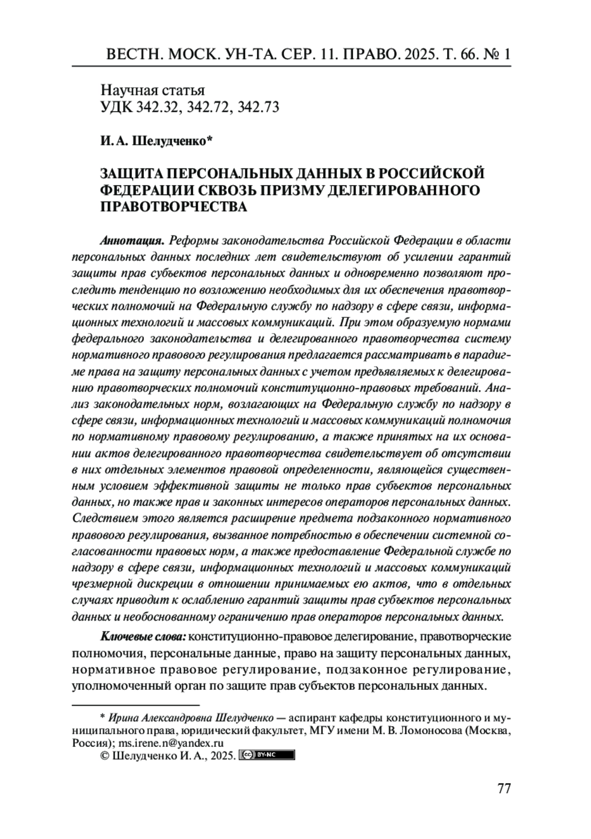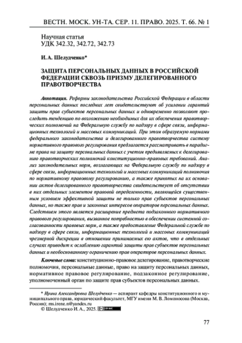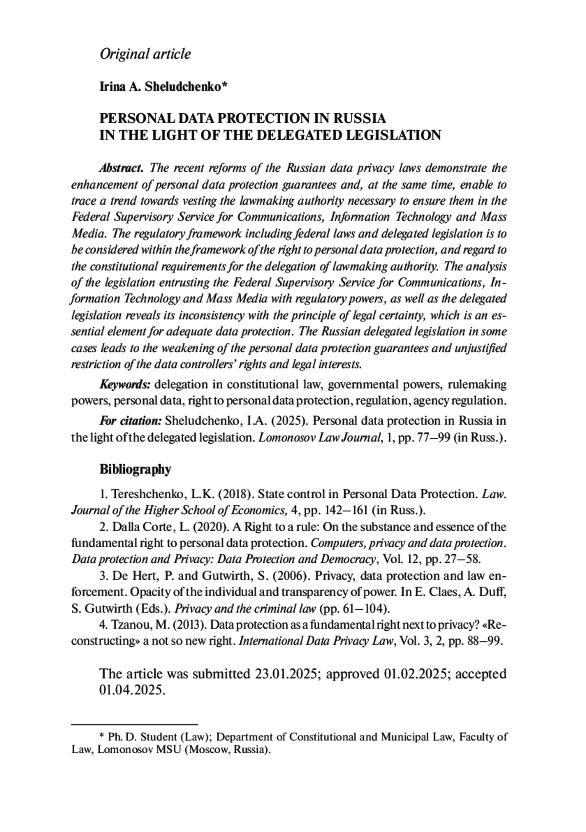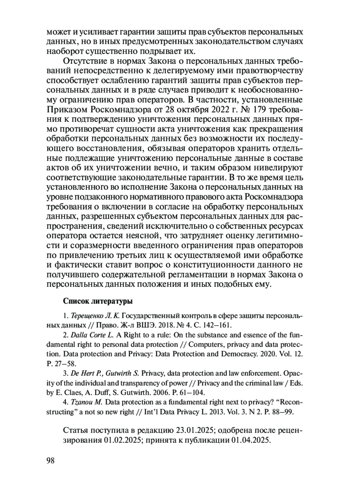 1. 	Терещенко Л. К. Государственный контроль в сфере защиты персональных данных // Право. Ж-л ВШЭ. 2018. № 4. С. 142-161.