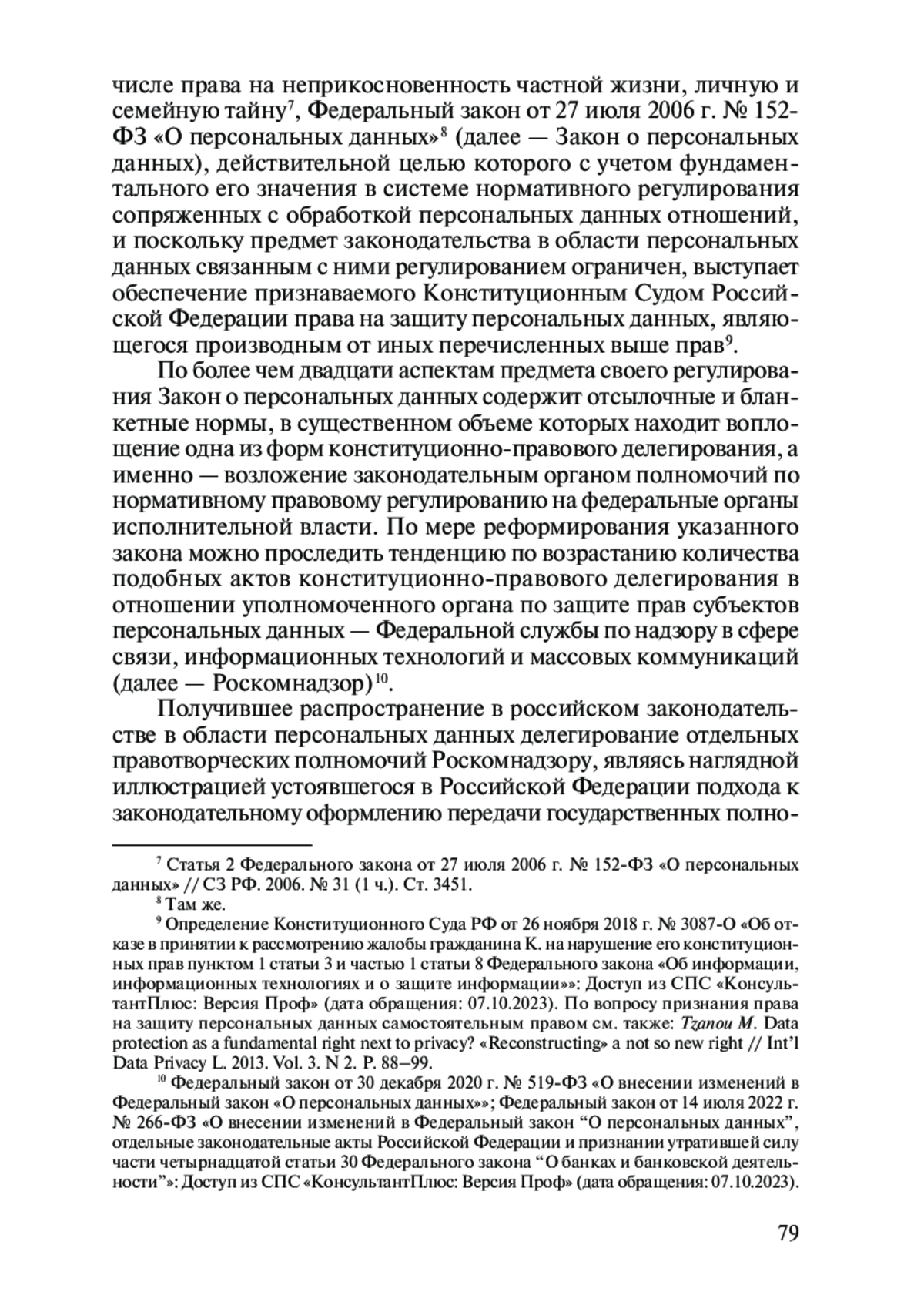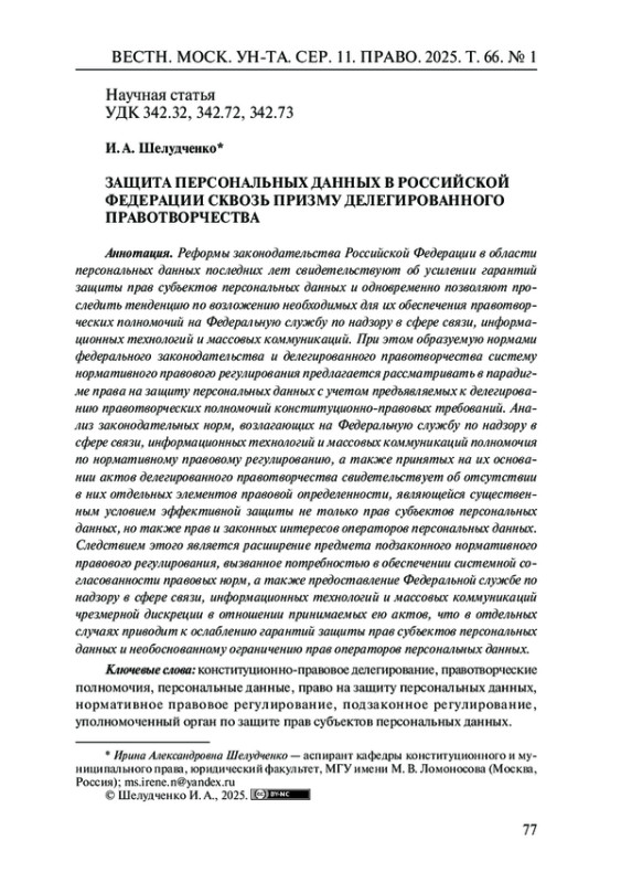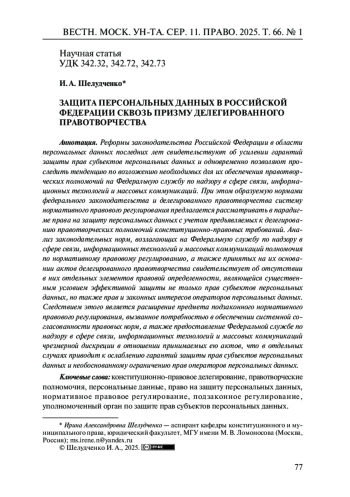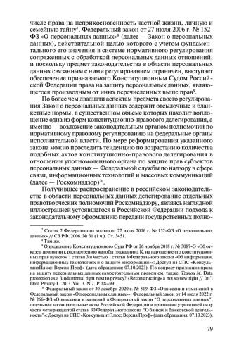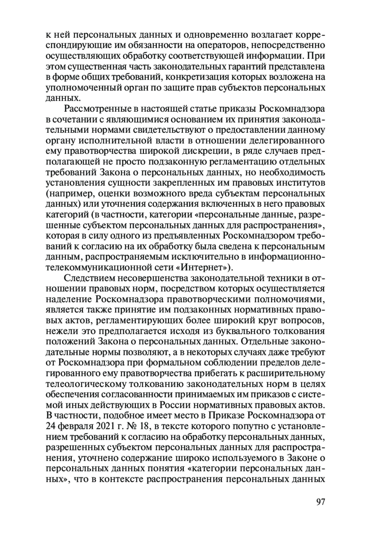 Реформы законодательства Российской Федерации в области персональных данных последних лет свидетельствуют об усилении гарантий защиты прав субъектов персональных данных и одновременно позволяют проследить тенденцию по возложению необходимых для их обеспечения правотворческих полномочий на Федеральную службу по надзору в сфере связи, информационных технологий и массовых коммуникаций. При этом образуемую нормами федерального законодательства и делегированного правотворчества систему нормативного правового регулирования предлагается рассматривать в парадигме права на защиту персональных данных с учетом предъявляемых к делегированию правотворческих полномочий конституционно-правовых требований. Анализ законодательных норм, возлагающих на Федеральную службу по надзору в сфере связи, информационных технологий и массовых коммуникаций полномочия по нормативному правовому регулированию, а также принятых на их основании актов делегированного правотворчества свидетельствует об отсутствии в них отдельных элементов правовой определенности, являющейся существенным условием эффективной защиты не только прав субъектов персональных данных, но также прав и законных интересов операторов персональных данных. Следствием этого является расширение предмета подзаконного нормативного правового регулирования, вызванное потребностью в обеспечении системной согласованности правовых норм, а также предоставление Федеральной службе по надзору в сфере связи, информационных технологий и массовых коммуникаций чрезмерной дискреции в отношении принимаемых ею актов, что в отдельных случаях приводит к ослаблению гарантий защиты прав субъектов персональных данных и необоснованному ограничению прав операторов персональных данных.