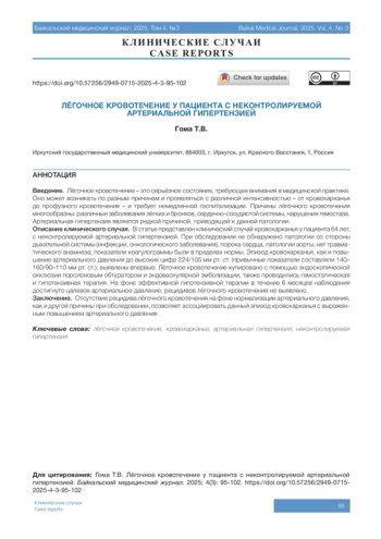 Введение. Лёгочное кровотечение – это серьёзное состояние, требующее внимания в медицинской практике. Оно может возникать по разным причинам и проявляться с различной интенсивностью – от кровохарканья до профузного кровотечения – и требует немедленной госпитализации. Причины лёгочного кровотечения многообразны: различные заболевания лёгких и бронхов, сердечно-сосудистой системы, нарушения гемостаза. Артериальная гипертензия является редкой причиной, приводящей к данной патологии.