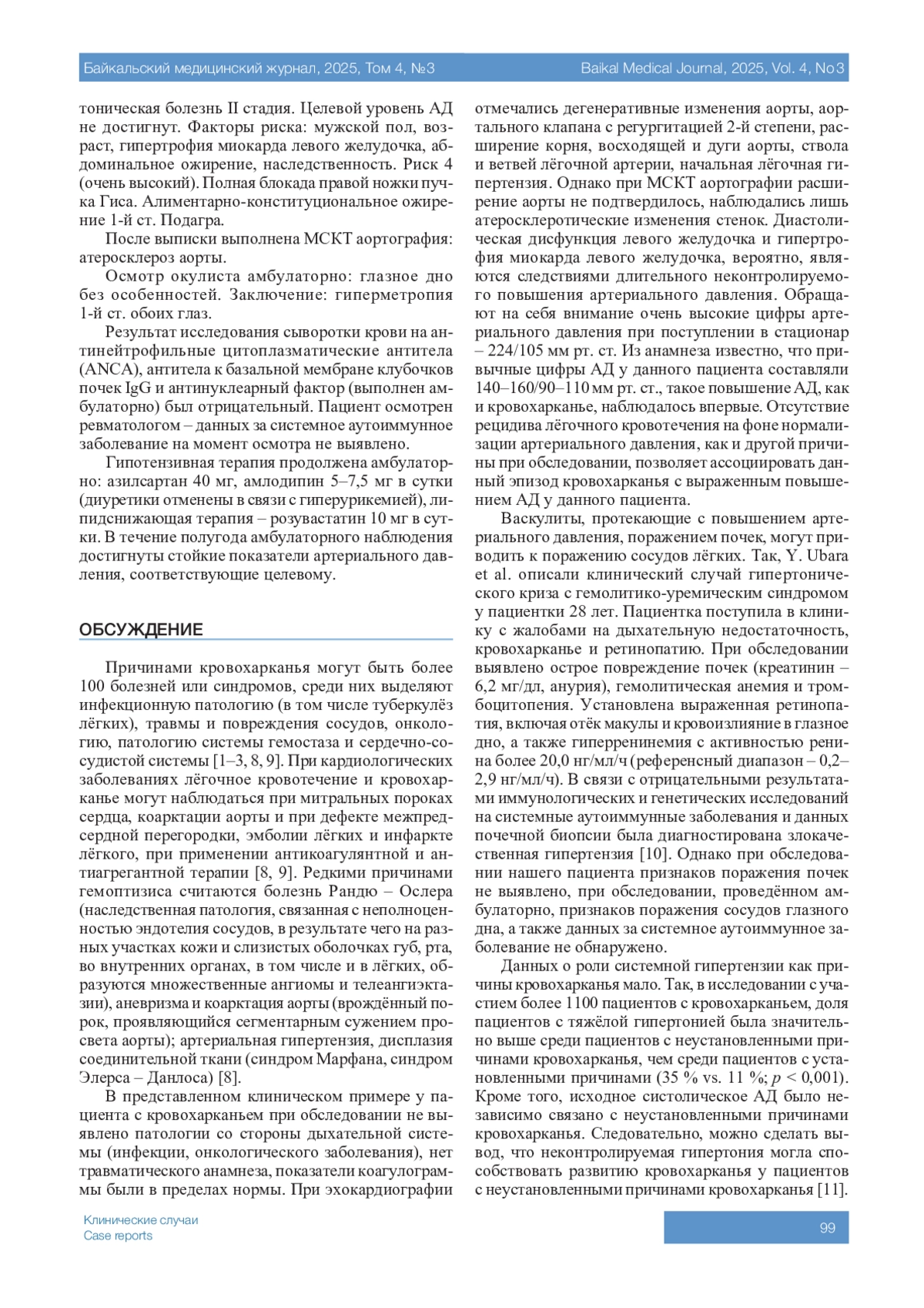 13. Basrak M.T., Alhammad M.F., Anjum S., Altermanini M., Ahmed Y.E. Diffuse Alveolar Hemorrhage: A Rare Complication of Severe Hypertension. Cureus. 2023;15(1):e33933. DOI: 10.7759/cureus.33933