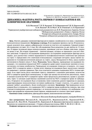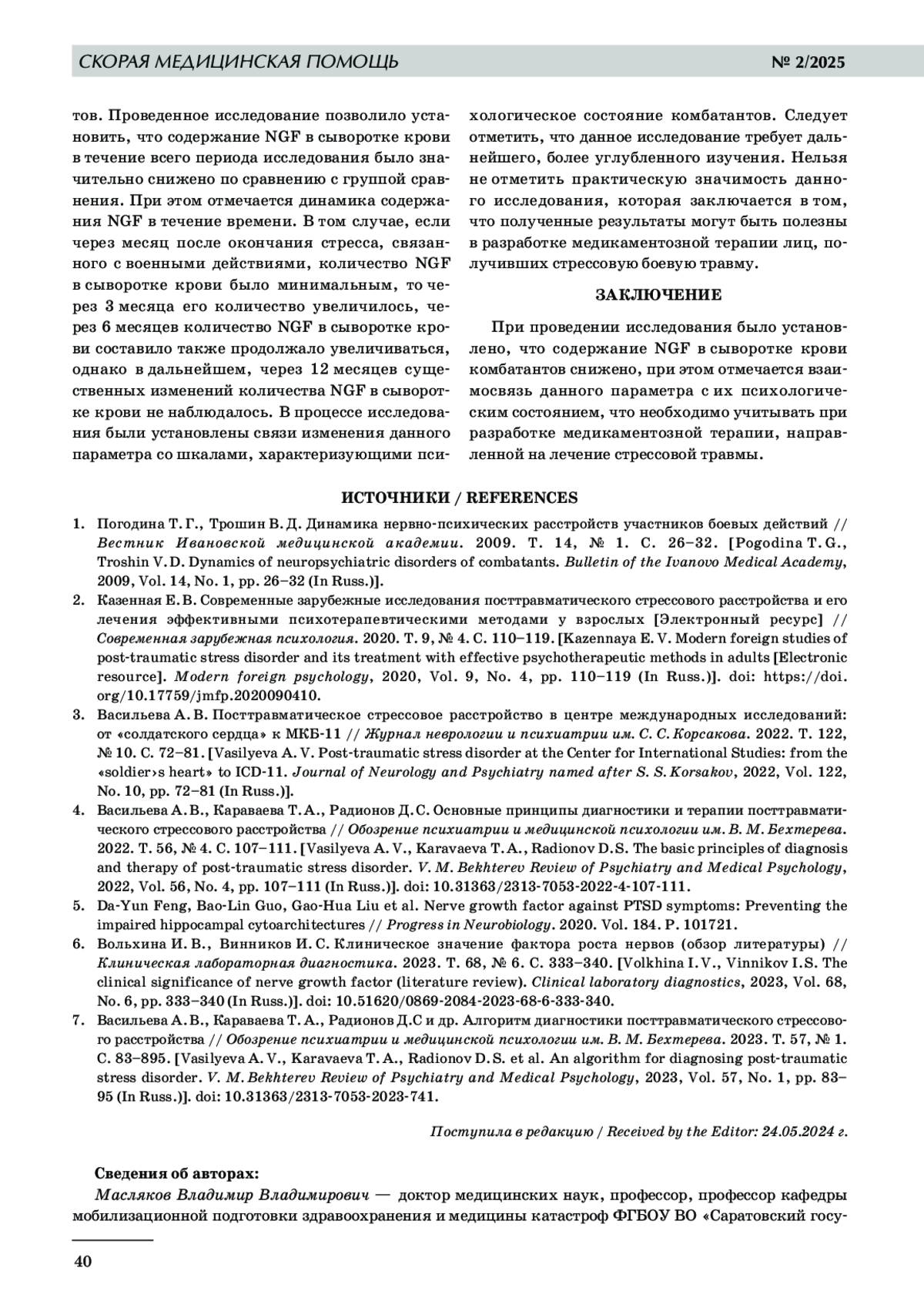 6. 	Вольхина И. В., Винников И. С. Клиническое значение фактора роста нервов (обзор литературы) // Клиническая лабораторная диагностика. 2023. Т. 68, № 6. С. 333-340.
