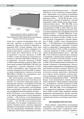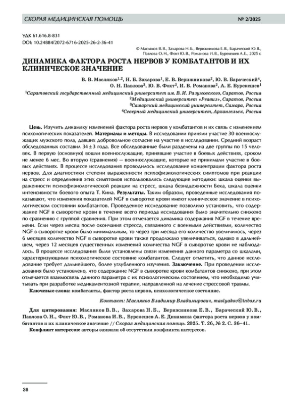 Цель. Изучить динамику изменений фактора роста нервов у комбатантов и их связь с изменением психологических показателей. Материалы и методы. В исследовании приняли участие 30 военнослужащих мужского пола, давших добровольное согласие на участие в исследовании. Средний возраст обследованных составил 34±3 года. Все обследованные были разделены на две группы по 15 человек. В первую (основную) вошли военнослужащие, принявшие участие в боевых действиях, сроком не менее 6 мес. Во вторую (сравнения) — военнослужащие, которые не принимали участие в боевых действиях. В процессе исследования проводилось исследование концентрации фактора роста нервов. Для диагностики степени выраженности психофизиологических симптомов при реакции на стресс и определения этих симптомов использовались следующие методики: шкала оценки выраженности психофизиологической реакции на стресс, шкала безнадежности Бека, шкала оценки интенсивности боевого опыта Т. Кина. Результаты. Таким образом, проведенные исследования показывают, что изменения показателей NGF в сыворотке крови имеют клиническое значение в психологическом состоянии комбатантов. Проведенное исследование позволило установить, что содержание NGF в сыворотке крови в течение всего периода исследования было значительно снижено по сравнению с группой сравнения. При этом отмечается динамика содержания NGF в течение времени. Если через месяц после окончания стресса, связанного с военными действиями, количество NGF в сыворотке крови было минимальным, то через три месяца его количество увеличилось, через 6 месяцев количество NGF в сыворотке крови также продолжало увеличиваться, однако в дальнейшем, через 12 месяцев существенных изменений количества NGF в сыворотке крови не наблюдалось. В процессе исследования были установлены связи изменения данного параметра со шкалами, характеризующими психологическое состояние комбатантов. Следует отметить, что данное исследование требует дальнейшего, более углубленного изучения. Заключение. При проведении исследования было установлено, что содержание NGF в сыворотке крови комбатантов снижено, при этом отмечается взаимосвязь данного параметра с их психологическим состоянием, что необходимо учитывать при разработке медикаментозной терапии, направленной на лечение стрессовой травмы.